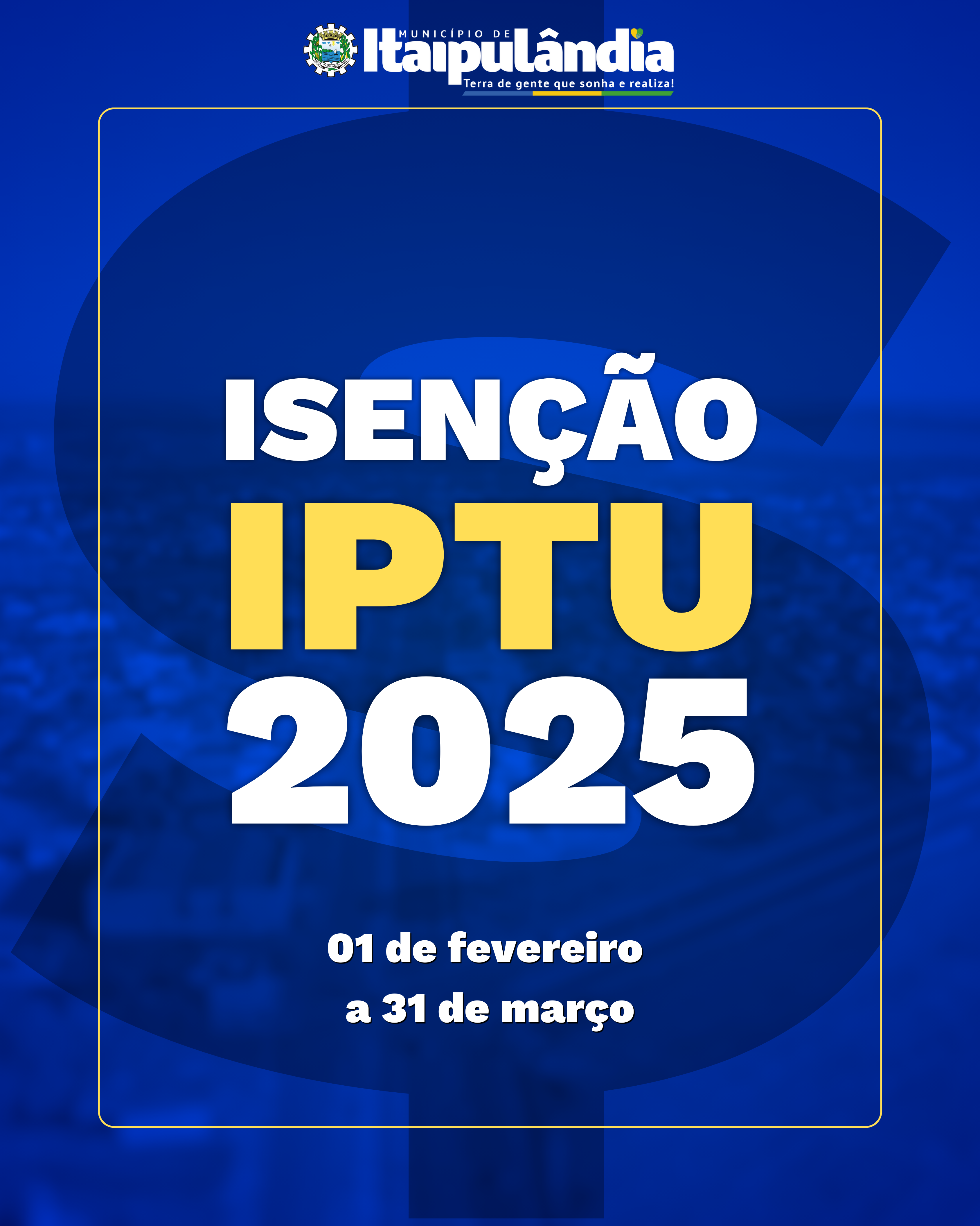 A Secretaria de Finanças do Município de Itaipulândia informa que os protocolos de pedidos de isenção do IPTU (Imposto Predial Territorial e Urbano) para o ano de 2025 iniciam em 01 de fevereiro.