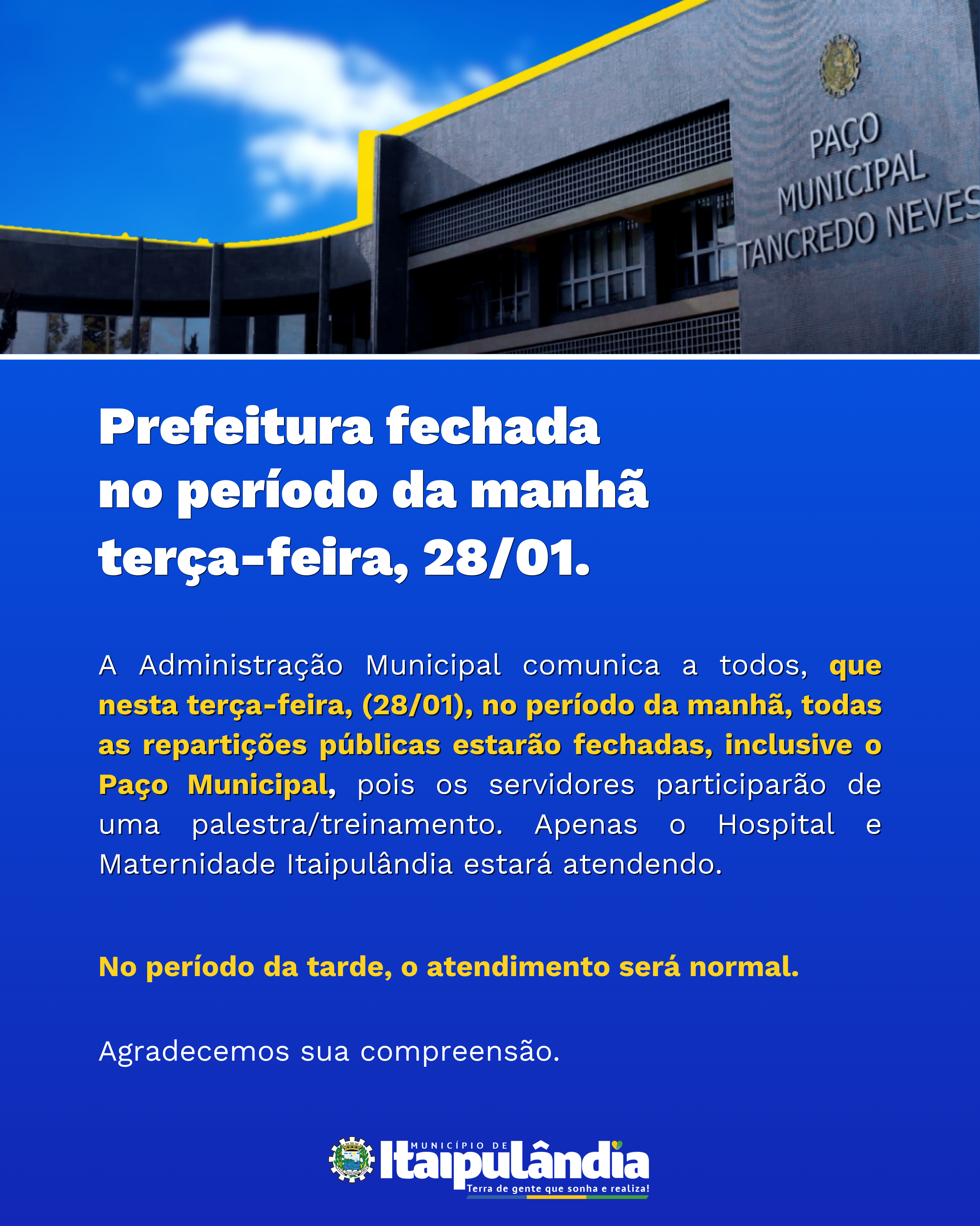 nformamos que nesta terça-feira, 28/01, no período da manhã, todas as repartições públicas estarão fechadas, incluindo o Paço Municipal. Isso porque nossos servidores estarão participando de uma importante palestra/treinamento.