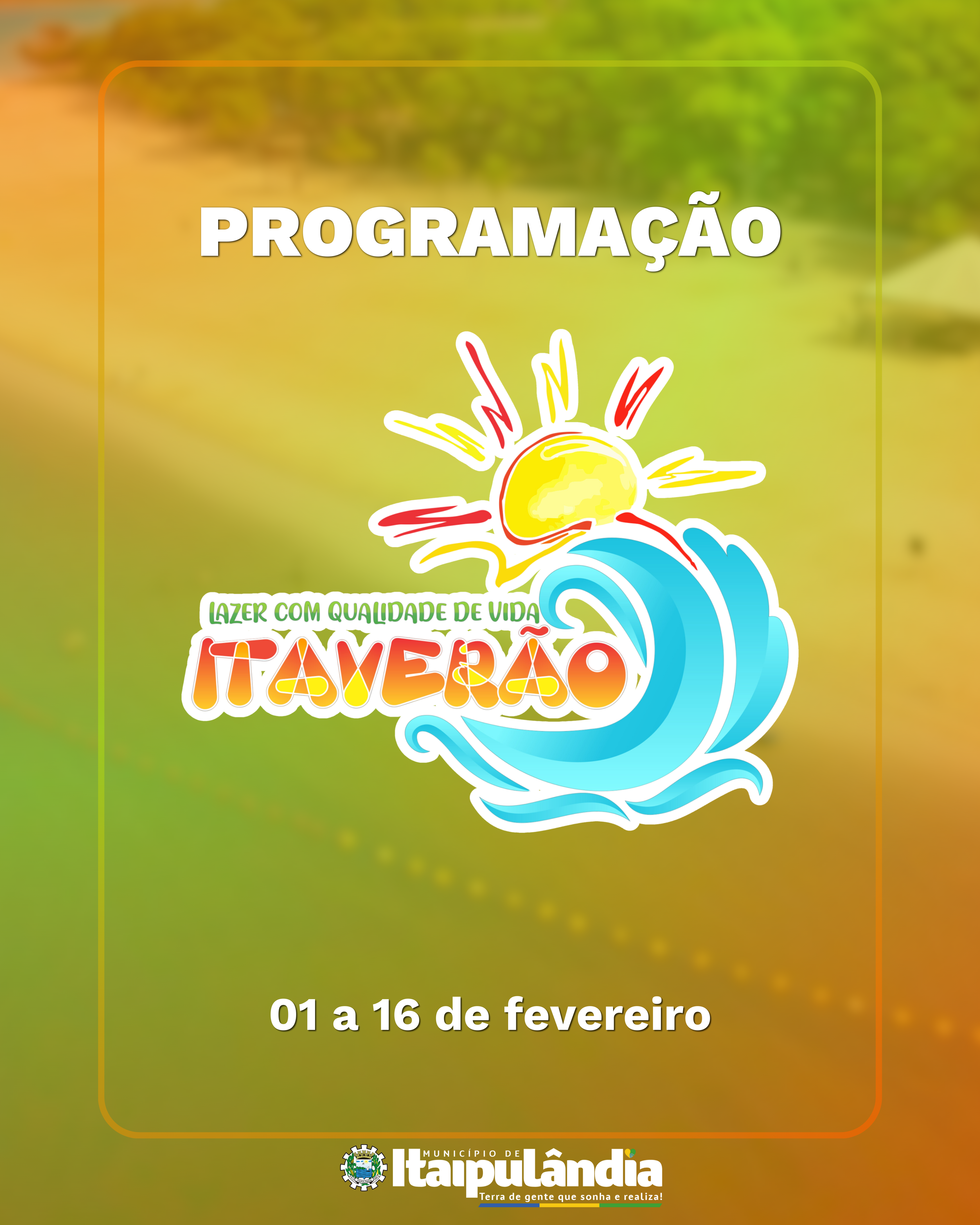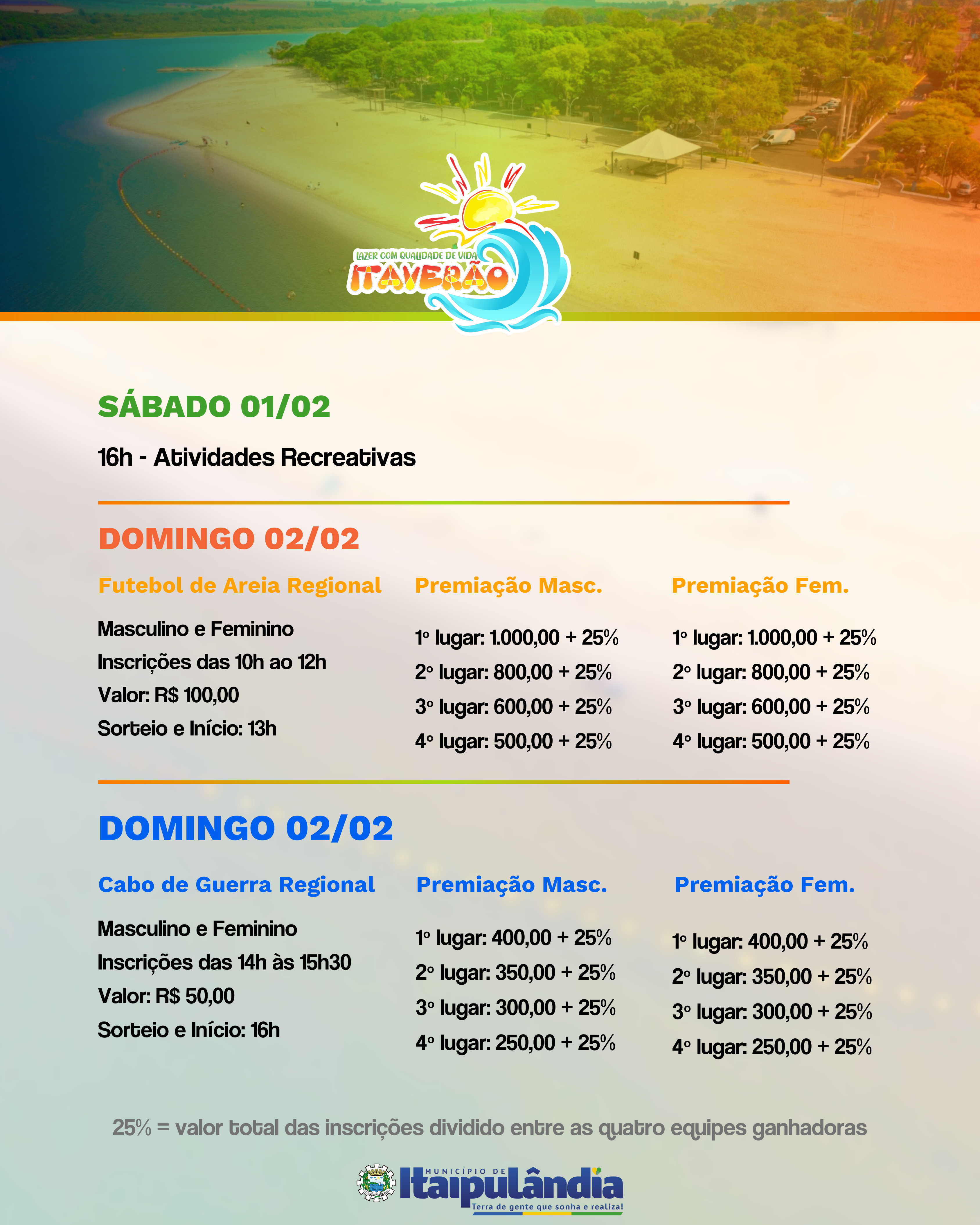 Confira a programação do primeiro final de semana do Itaverão 2025: 01/02/2025 – SÁBADO Atividades Recreativas 02/02/2025 – DOMINGO Futebol de areia e cabo de guerra regionais (masculino e feminino) e atividades recreativas. OBS: Atividades esportivas com ótima premiação.
