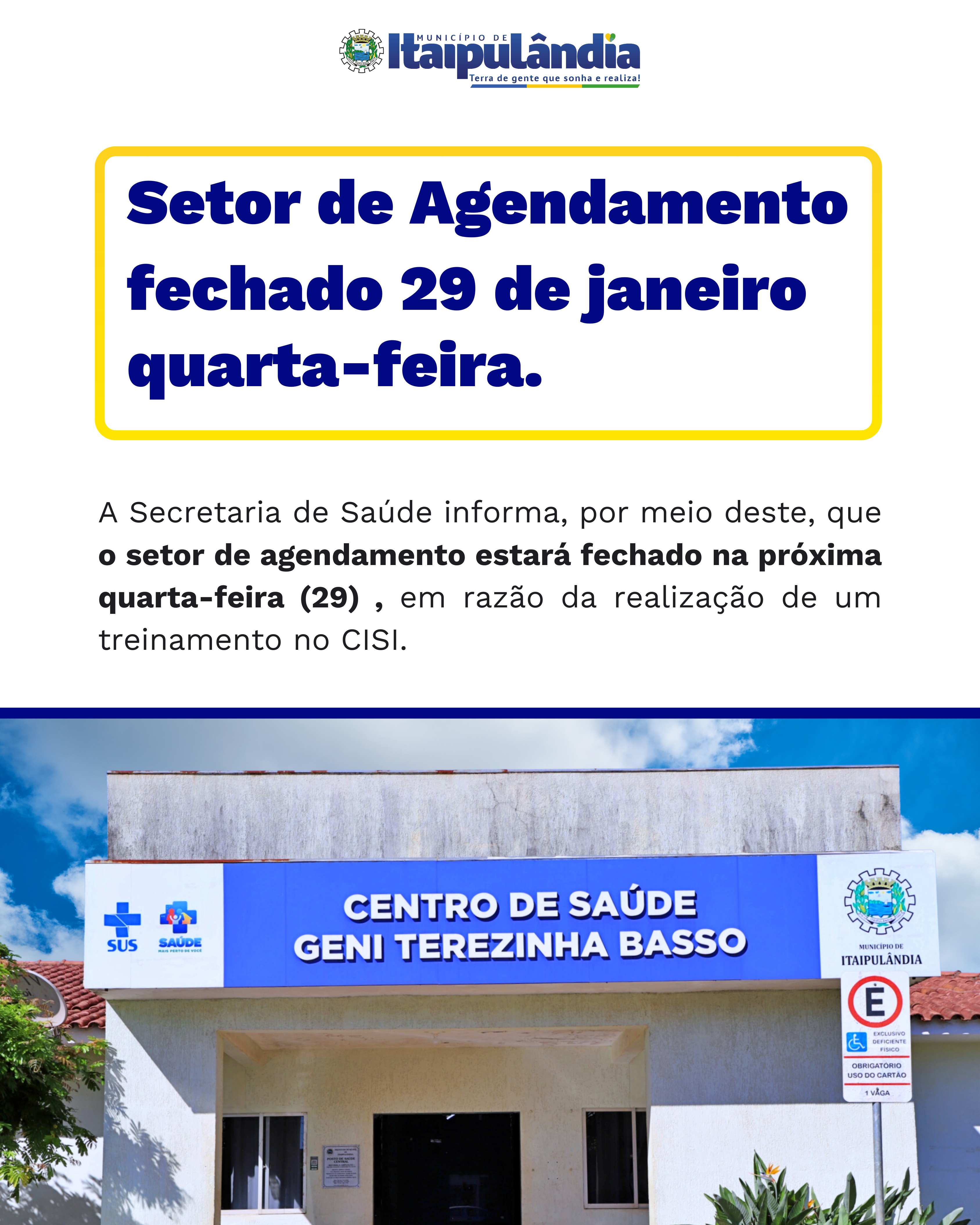 A Secretaria de Saúde informa, por meio deste, que o setor de agendamento estará fechado na próxima quarta-feira, dia 29, em razão da realização de um treinamento no CISI.