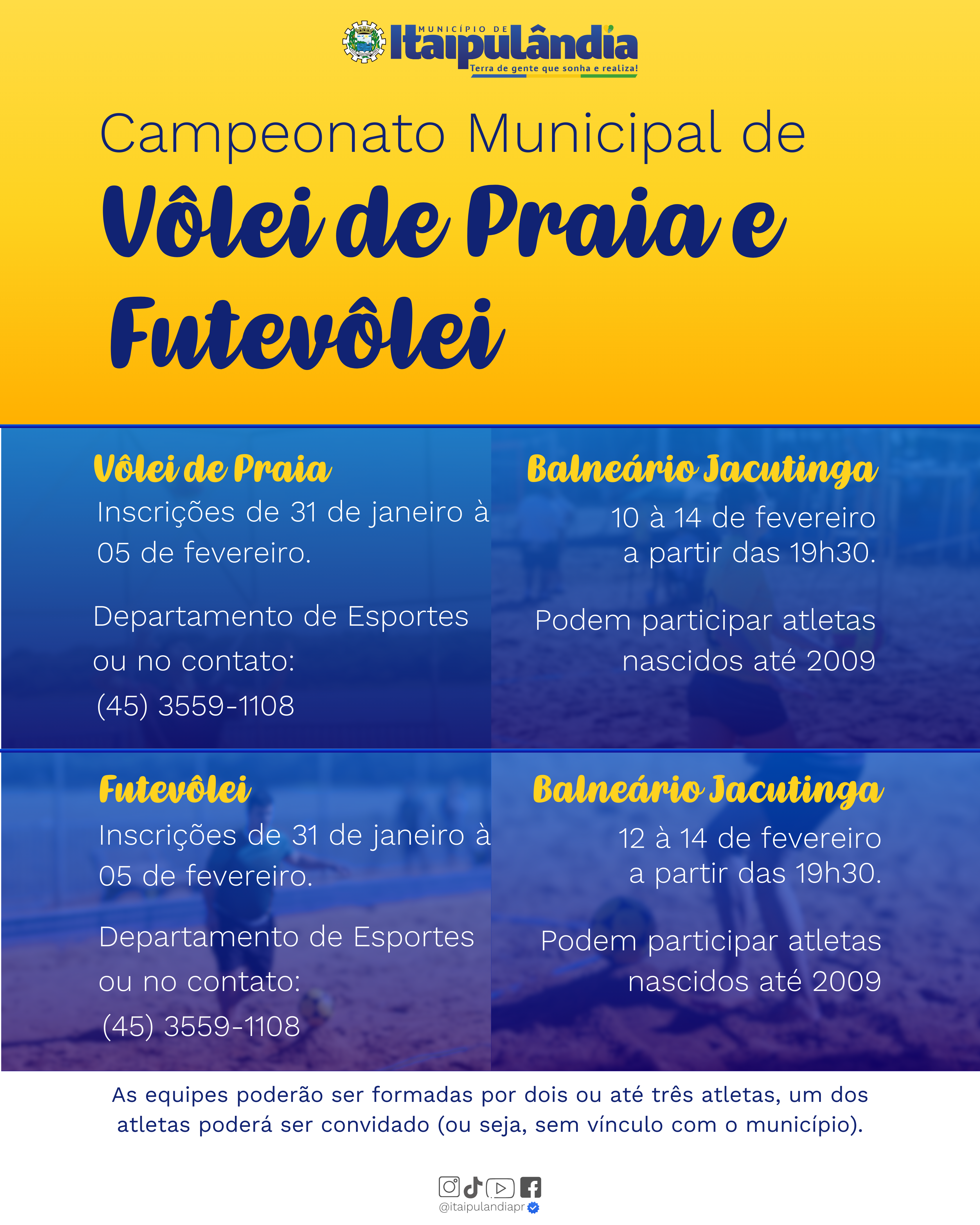 Vôlei de Praia (Masculino e Feminino) 10 a 14 de fevereiro | ⏰ A partir das 19h30 | 📍 Balneário Jacutinga