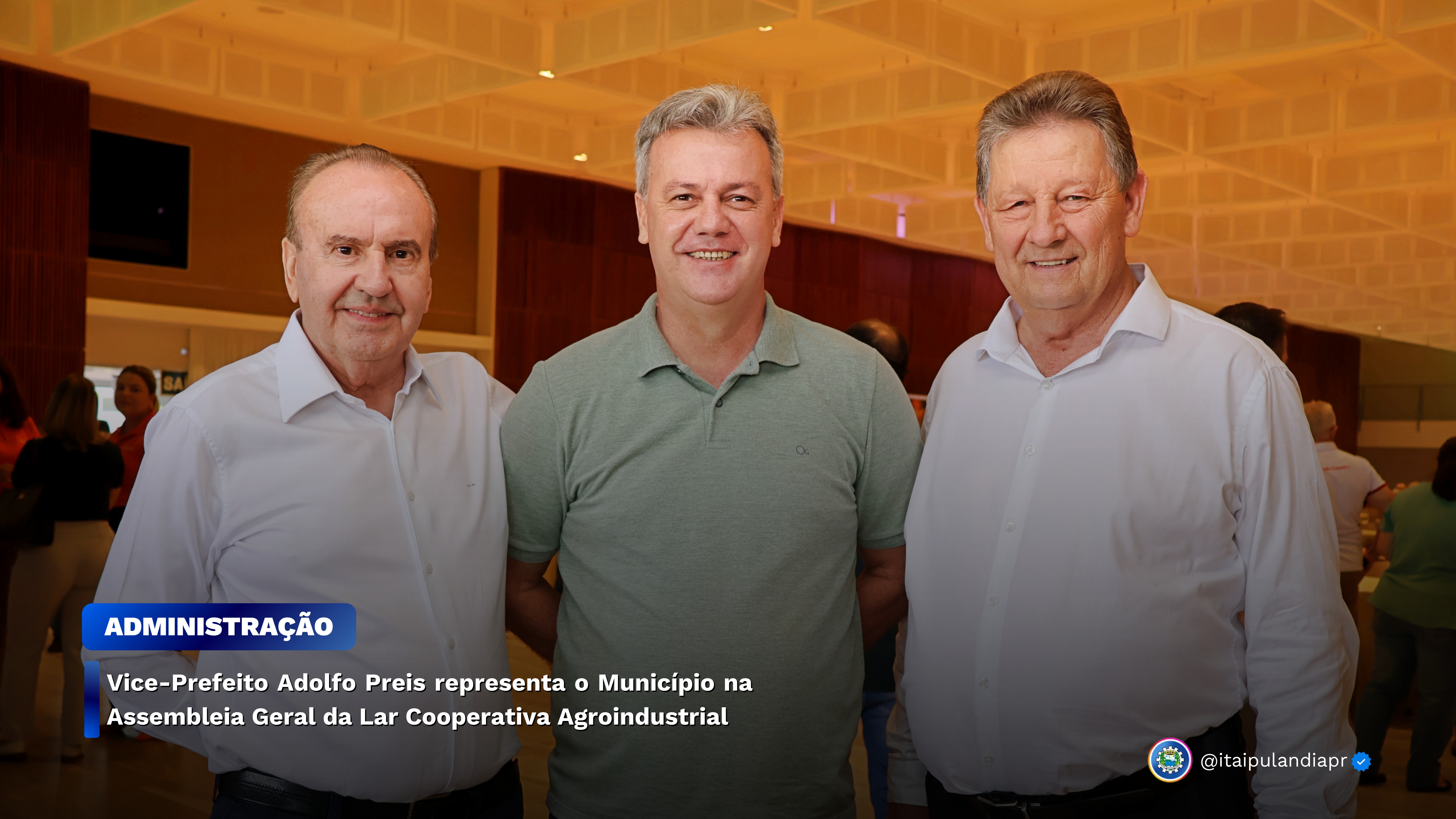 O Vice-Prefeito de Itaipulândia Adolfo Preis, representou o município, na última sexta-feira (31), na Assembleia Geral ordinária da Lar Cooperativa Agroindustrial realizada no Lar Centro de Eventos em Medianeira. O evento, que contou com a participação da Diretoria, Conselho Fiscal, associados e autoridades, teve como principal item na pauta a prestação de contas referente ao exercício 2024.