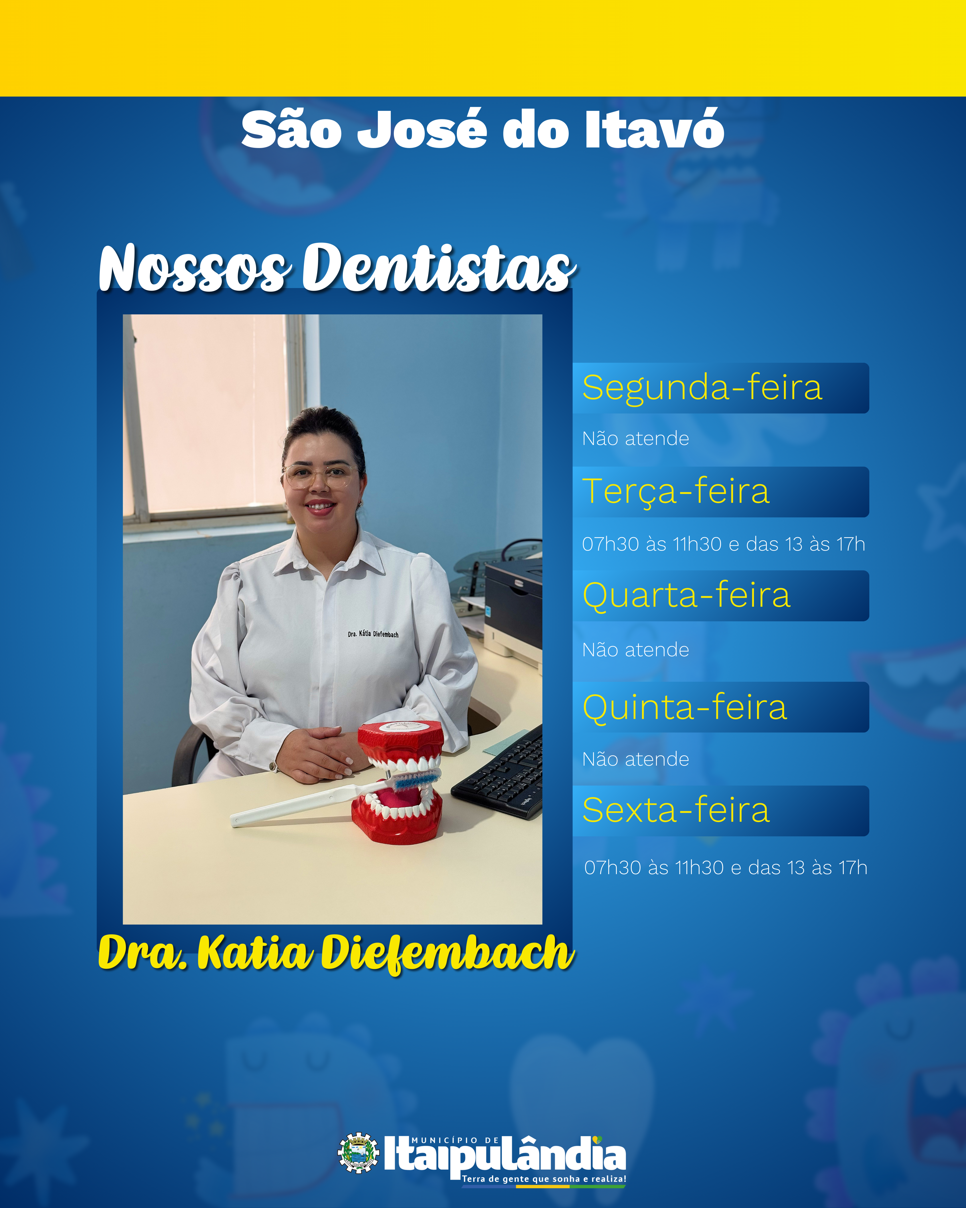 ➡️ São José do Itavó 👩⚕️ Dra. Kátia Diefembach 🗓 Terça-feira e sexta-feira: ⏰ 07h30 às 11h30 | 13h às 17h