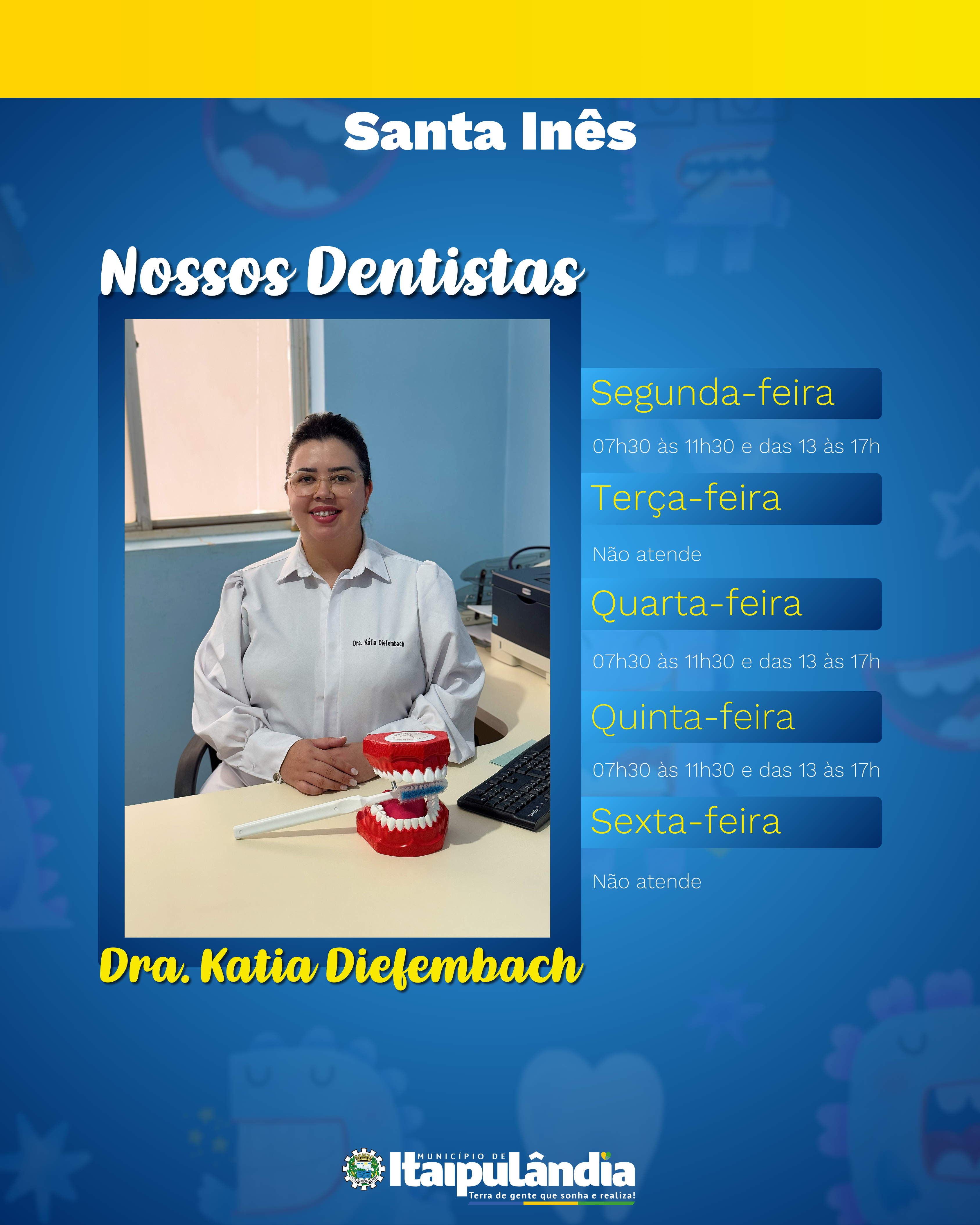 ➡️ Santa Inês 👩⚕️ Dra. Kátia Diefembach 🗓 Segunda, quarta e quinta-feira: ⏰ 07h30 às 11h30 | 13h às 17h