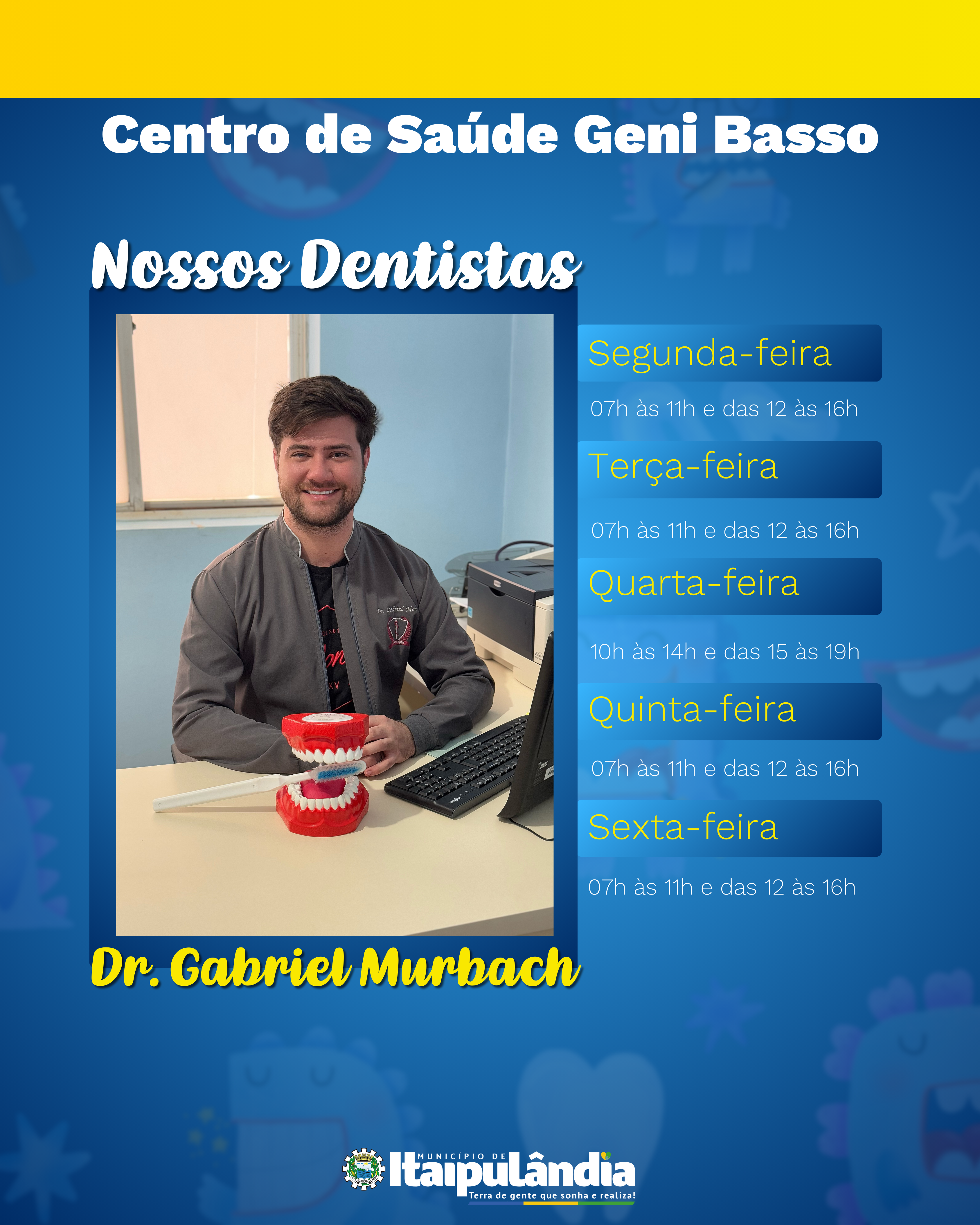 ➡️ Centro de Saúde Geni Terezinha Basso 👨⚕️ Dr. Gabriel Murbach 🗓 Segunda, terça, quinta e sexta-feira: ⏰ 07h às 11h | 12h às 16h 🗓 Quartas-feiras: ⏰ 10h às 14h | 15h às 19h ⚠️ Na última quarta-feira do mês, não há atendimento devido à reunião de equipe.