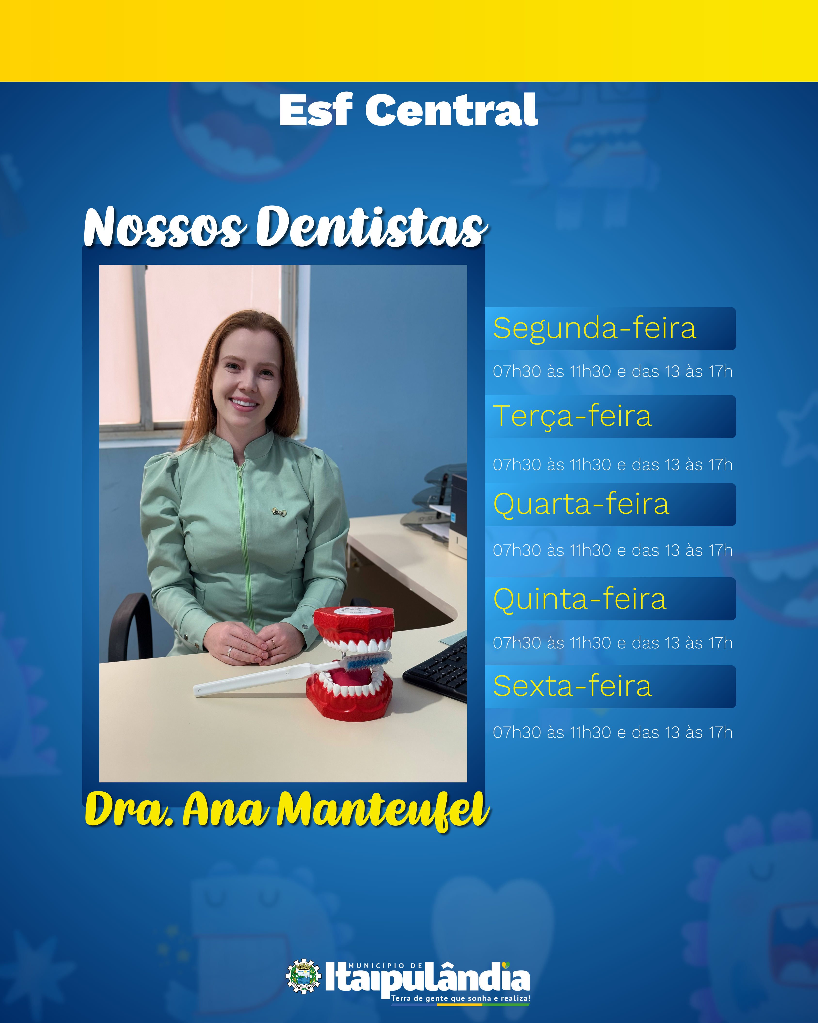 ➡️ ESF Central (ao lado do SAMU) 👩⚕️ Dra. Ana Manteufel 🗓 Segunda a sexta-feira: ⏰ 07h30 às 11h30 | 13h às 17h
