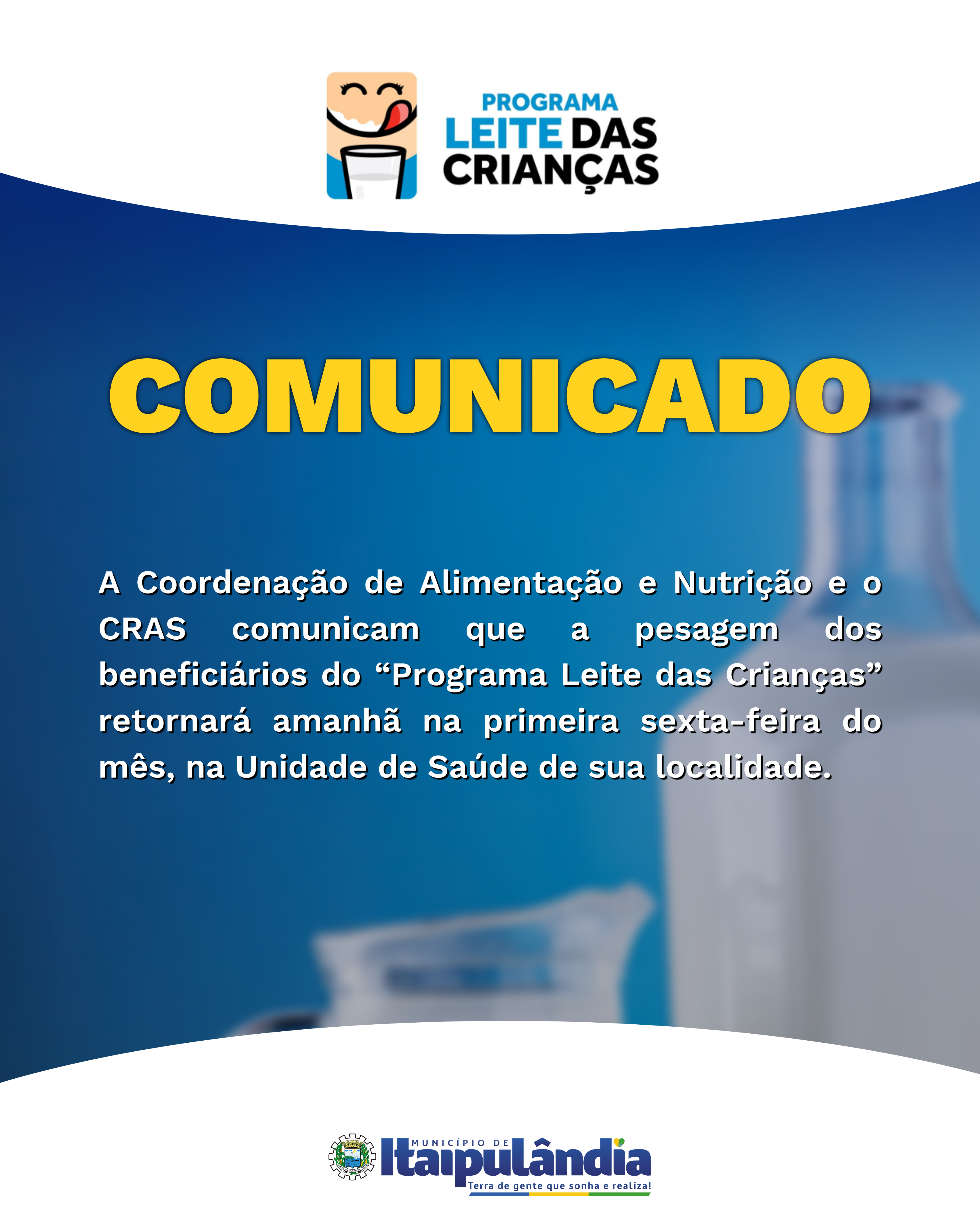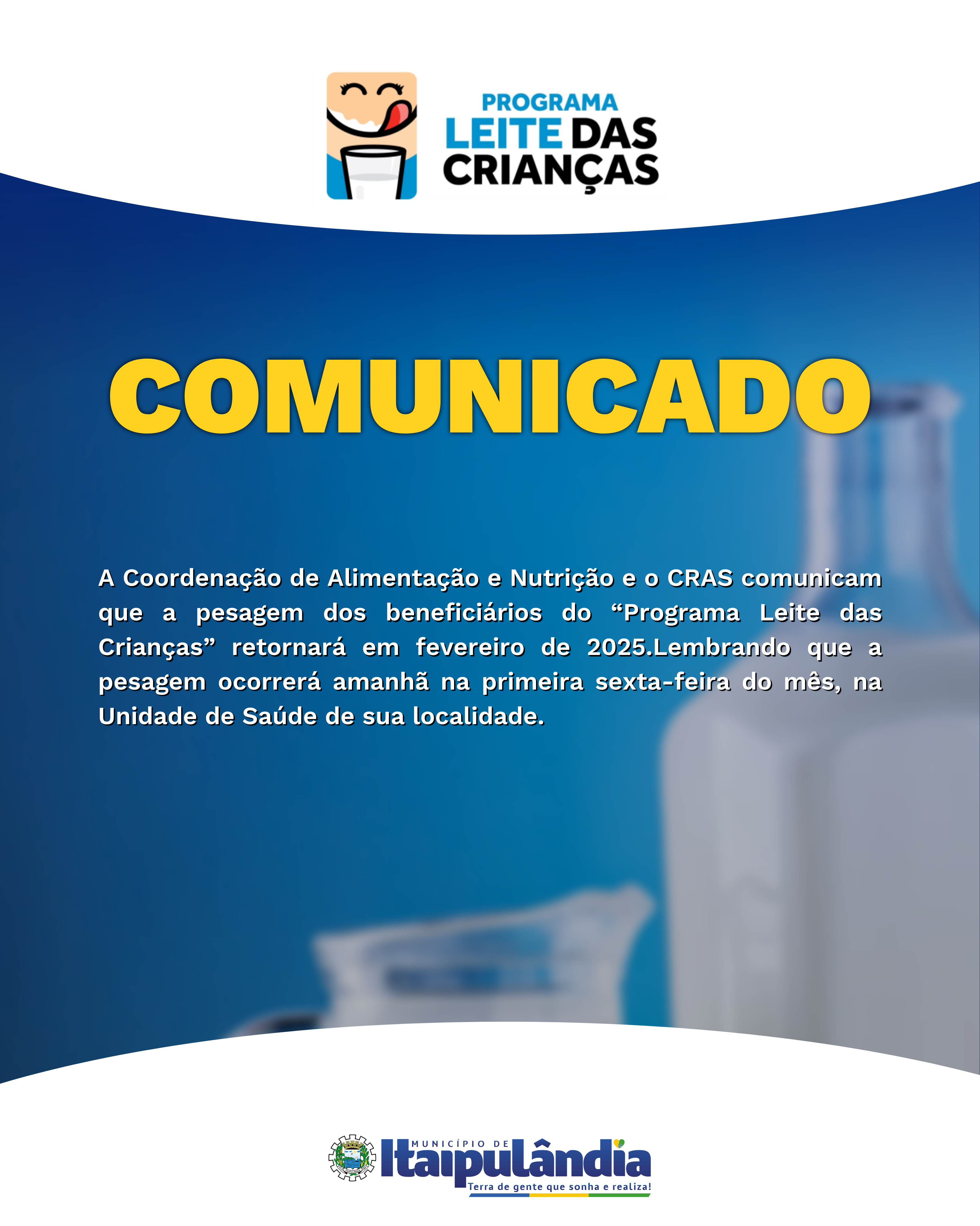 A pesagem retornará em fevereiro de 2025 e será realizada sempre na primeira sexta-feira do mês ou seja, AMANHÃ na Unidade de Saúde da sua localidade.