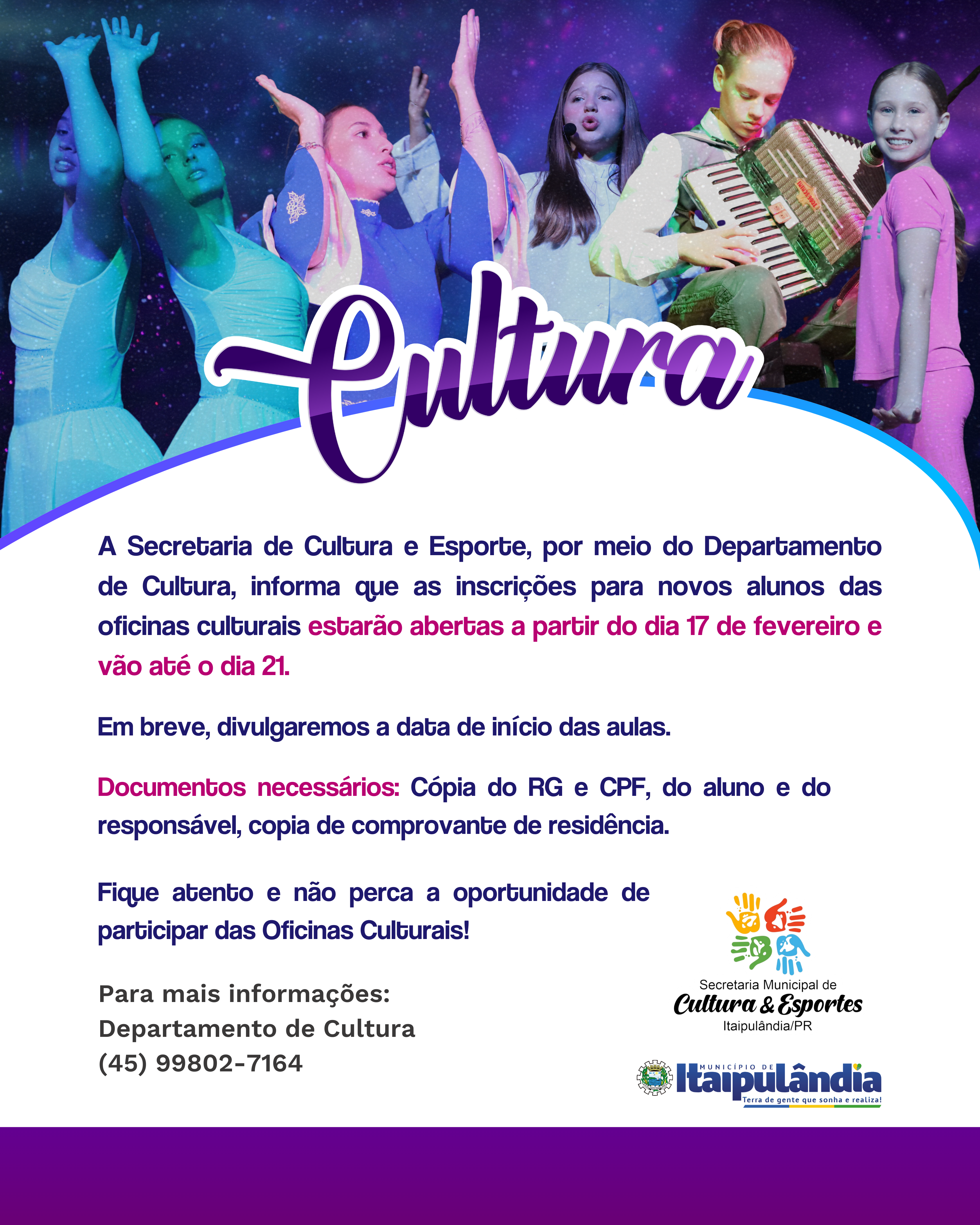 Mais informações? Entre em contato com o Departamento de Cultura pelo número: (45) 99802-7164.