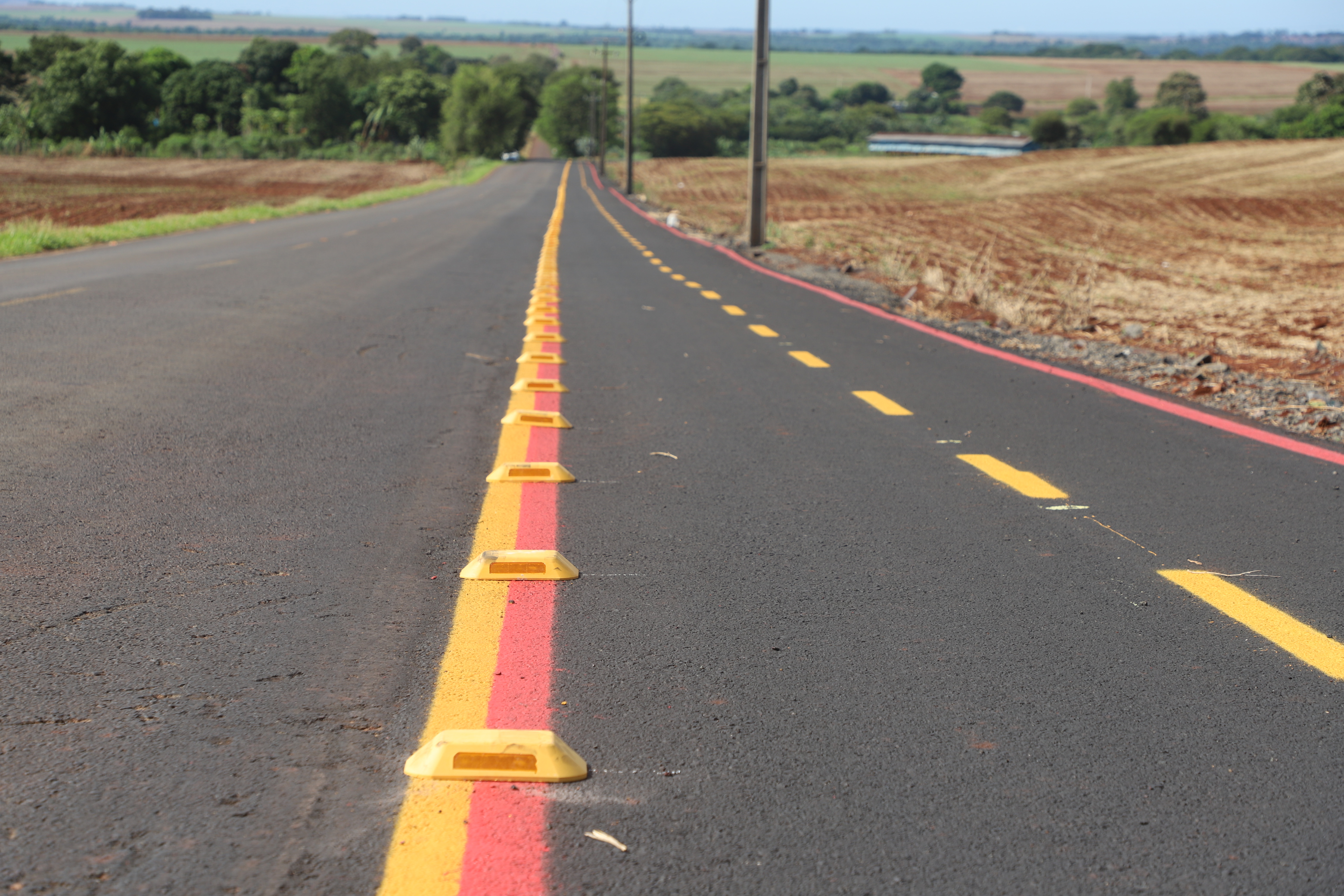 A pista da ciclofaixa está praticamente concluída e as pinturas das faixas de sinalização horizontal já foi efetuada e nesse momento a empresa está fixando tachões refletivos balizadores entre a pista de rolamento a ciclofaixa.