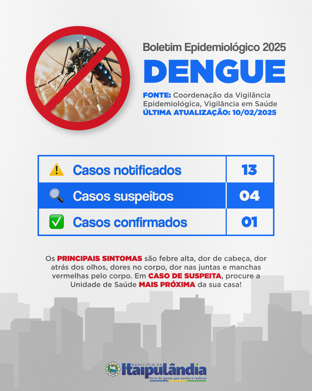 A Secretaria Municipal de Saúde, através da Vigilância em Saúde, atualizou os casos de dengue no Município de Itaipulândia. Até 10 de fevereiro, 01 caso foi confirmado. É importante estar informado e tomar medidas de prevenção. Em caso de suspeita, procure a Unidade de Saúde mais próxima da sua casa.