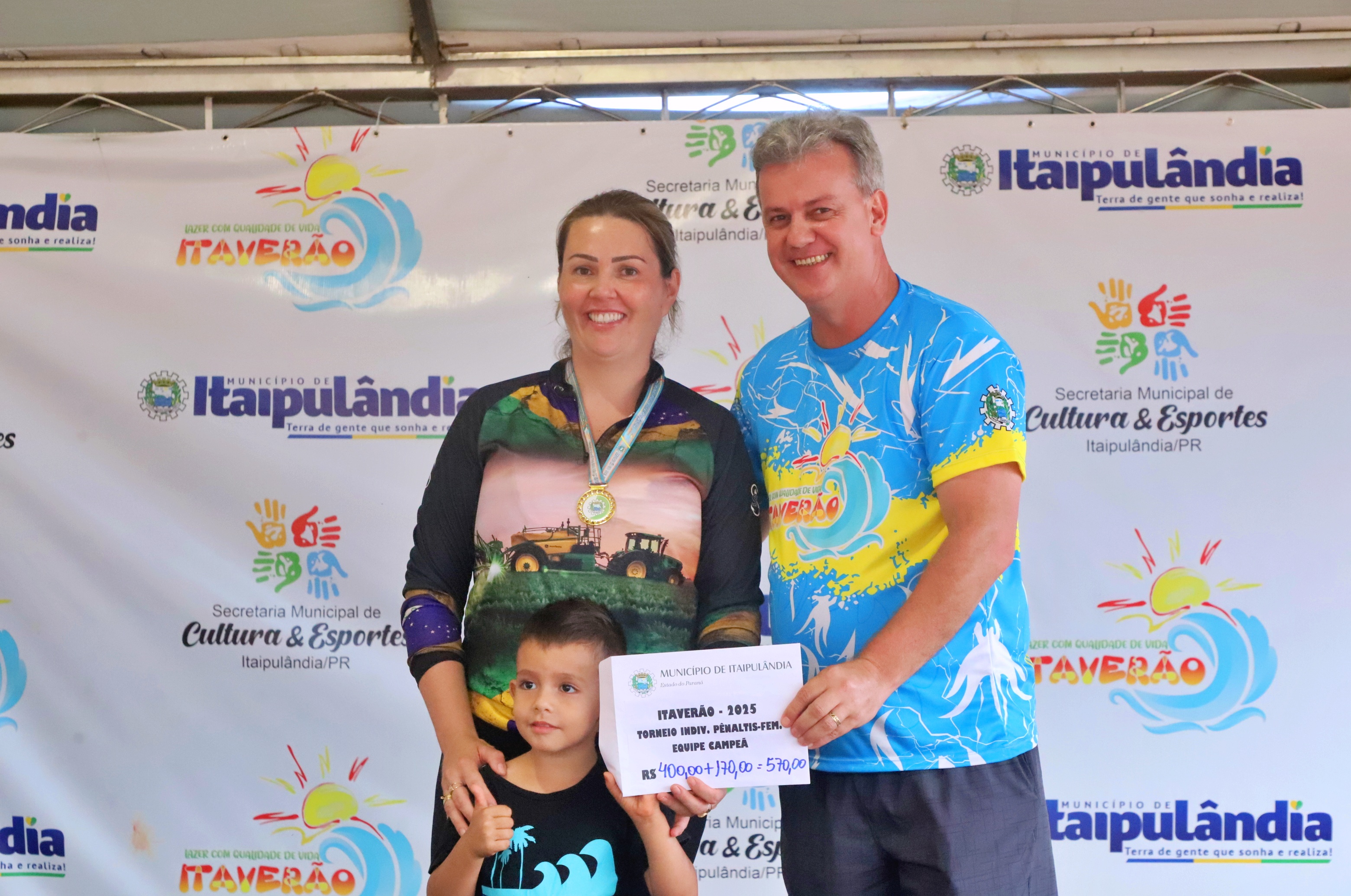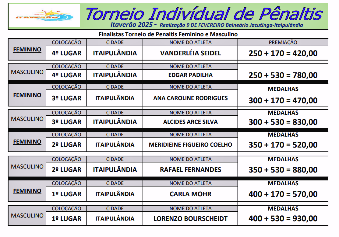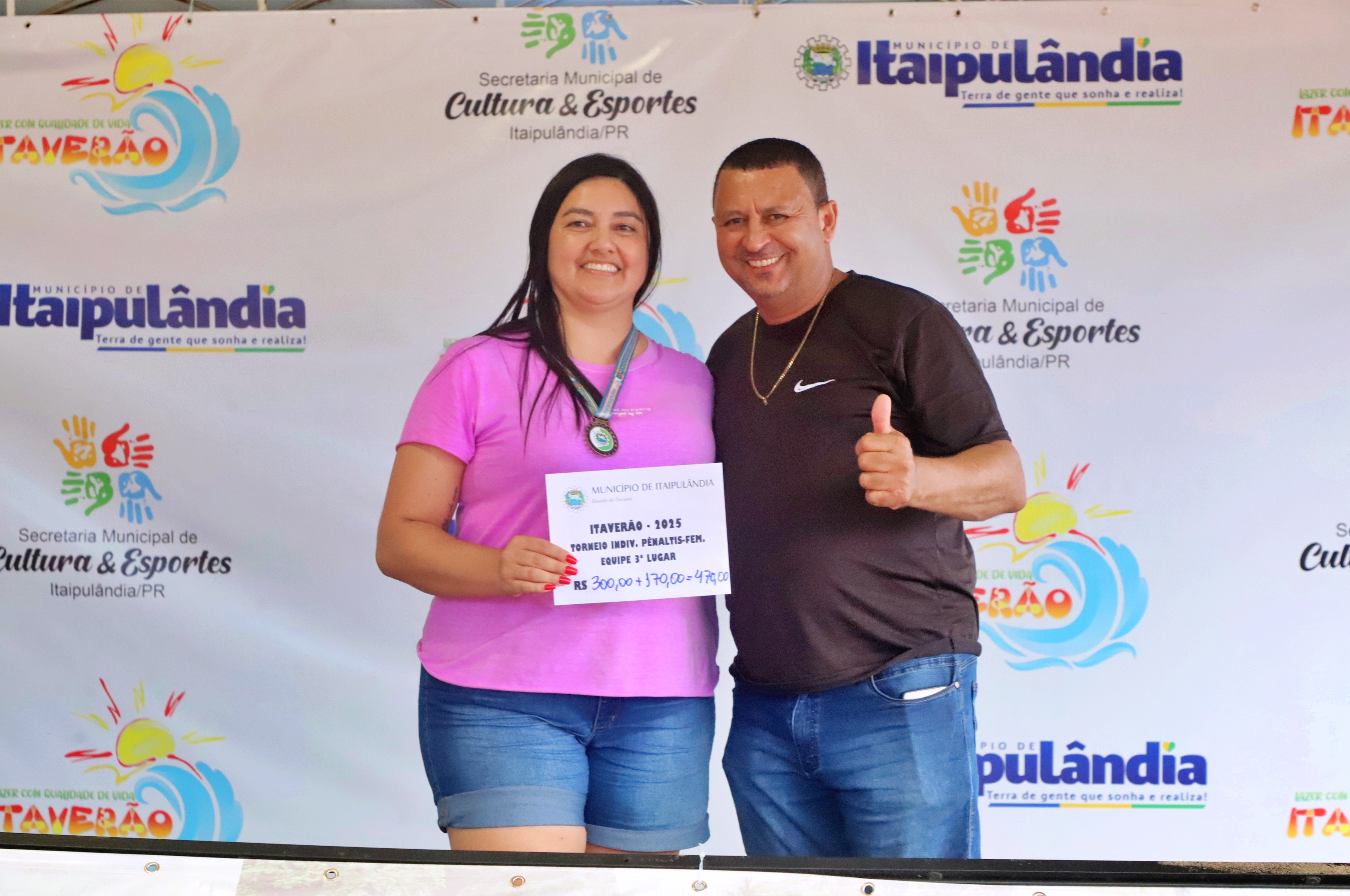 Ao final da competição foram premiados os vencedores de cada categoria, ficando assim a classificação final: TORNEIO DE PÊNALTIS FEMININO CAMPEÃ: Carla Mohr – Itaipulândia PREMIAÇÃO: R$570,00 VICE-CAMPEÃ: Meridieine – Itaipulândia PREMIAÇÃO: R$520,00 3º LUGAR: Ana Caroline – Itaipulândia PREMIAÇÃO: R$470,00 4º LUGAR: Vanderleia – Itaipulândia PREMIAÇÃO: R$420,00