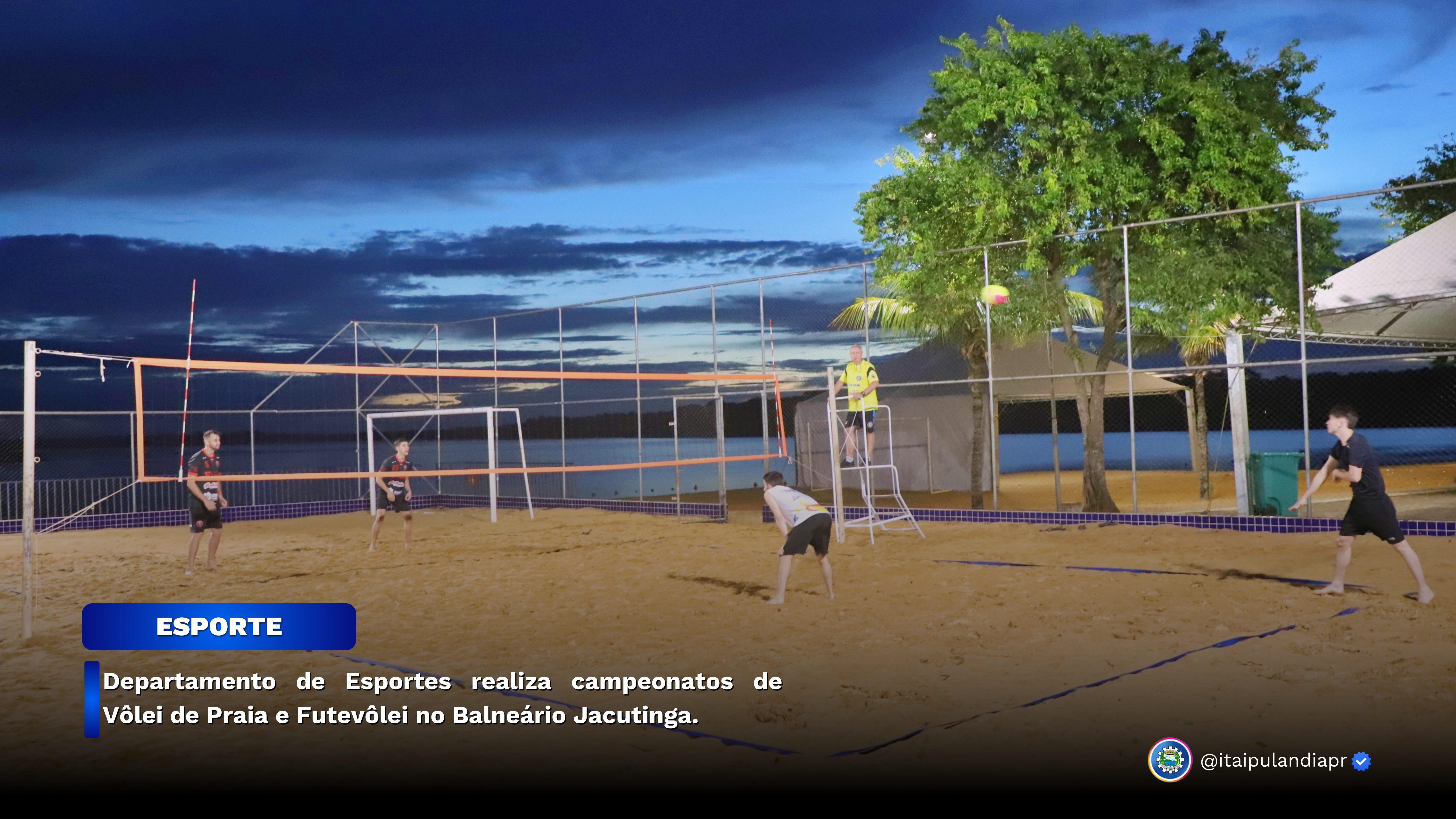 O Departamento Municipal de Esportes de Itaipulândia está promovendo os Campeonatos Municipais de Vôlei de Praia e Futevôlei no Balneário de Jacutinga. As competições reúnem atletas locais e acontecem no período da noite.