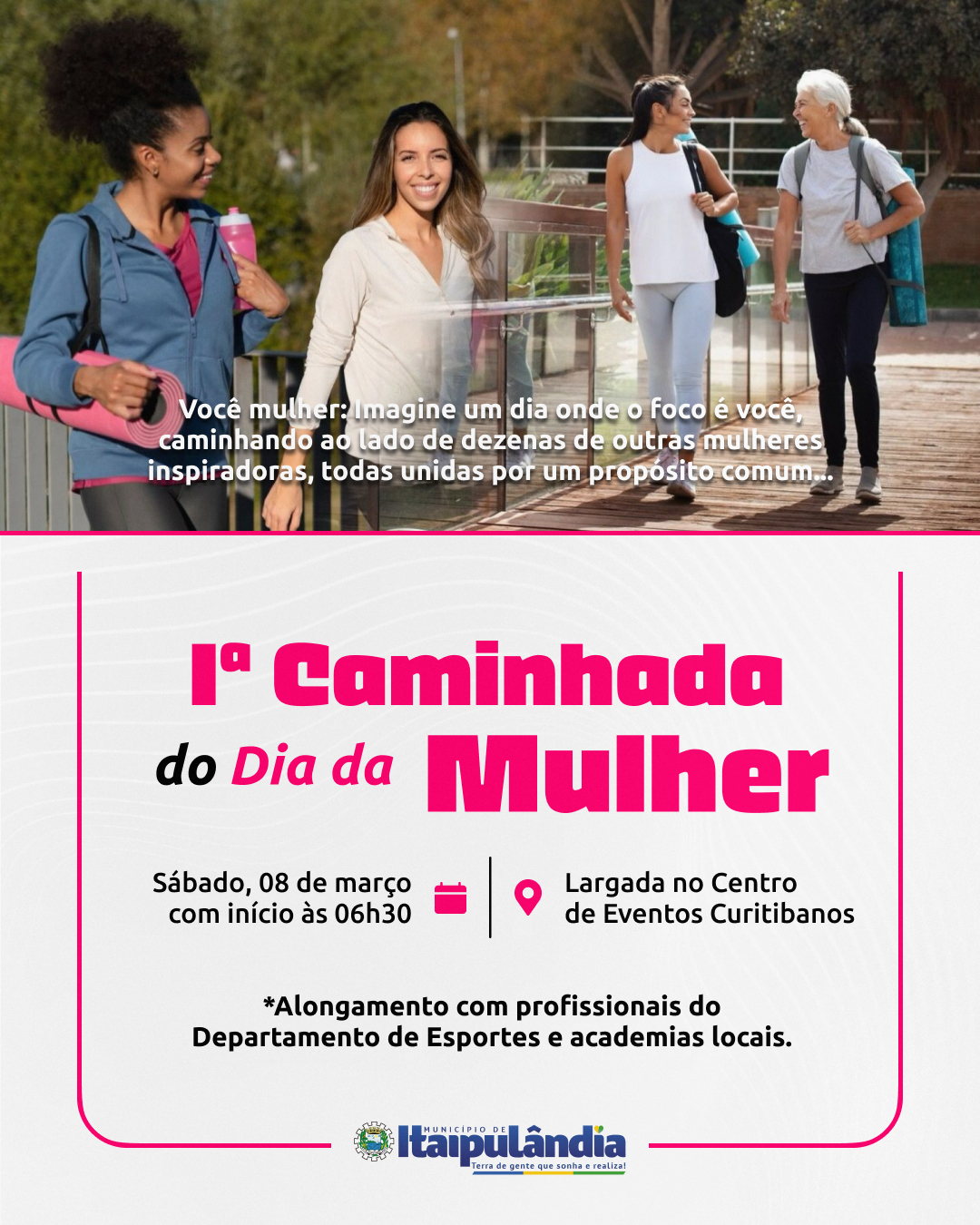 A Administração Municipal preparou com carinho uma programação especial para celebrar o Dia da Mulher em Itaipulândia: comece o dia com energia e bem-estar participando da caminhada, que inicia às 06h30 no Centro de Eventos Curitibanos (Anel Viário). Antes da largada, alongamento com profissionais do Departamento de Esportes e academias locais.