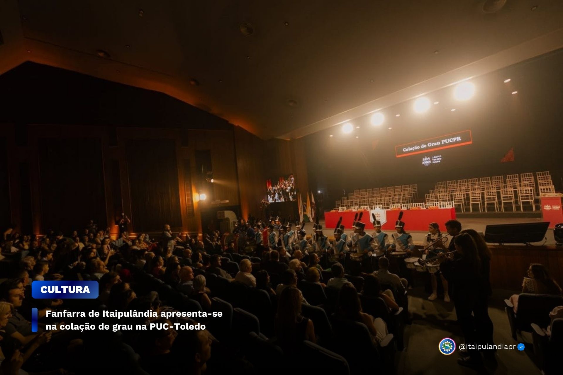 Nesta semana, na quarta e quinta-feira (19 e 20), os alunos da oficina de Fanfarra de Itaipulândia abrilhantaram a cerimônia de colação de grau na PUC de Toledo. Pelo segundo ano consecutivo, os talentosos alunos, conduzidos pelo professor Jair Muller, se apresentaram em eventos da PUC demonstrando todo seu empenho e dedicação.