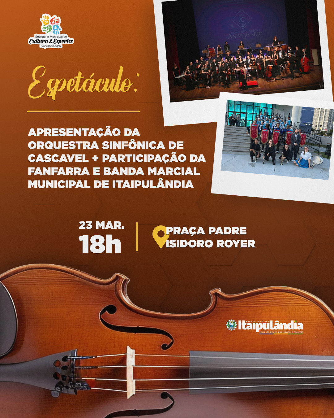 Venha prestigiar este evento dia 23/03 (domingo), às 18h na Praça Padre Isidoro Royer.