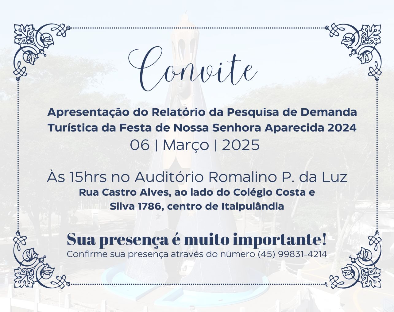 Na quinta-feira (06), no Auditório Professor Romalino Pereira da Luz, anexo ao Colégio Costa e Silva, será apresentado o relatório da pesquisa de demanda turística da Festa de Nossa Senhora Aparecida em Itaipulândia. A coleta dos dados foi realizada na programação da Semana da Padroeira de 2024, em uma parceria entre a Associação do Santuário e Administração Municipal por meio da Secretaria de Turismo e Lazer e Parquetec da Itaipu Binacional, a equipe responsável pela pesquisa, coordenada pela Marlene Huebes Novaes, consultora técnica Dra em turismo, e estará apresentando os dados tabulados. Será um evento de suma importância e aberto à população, que traz informações detalhadas, traçando o perfil dos visitantes de Itaipulândia e permite planejar passos para o setor turístico de maneira geral.