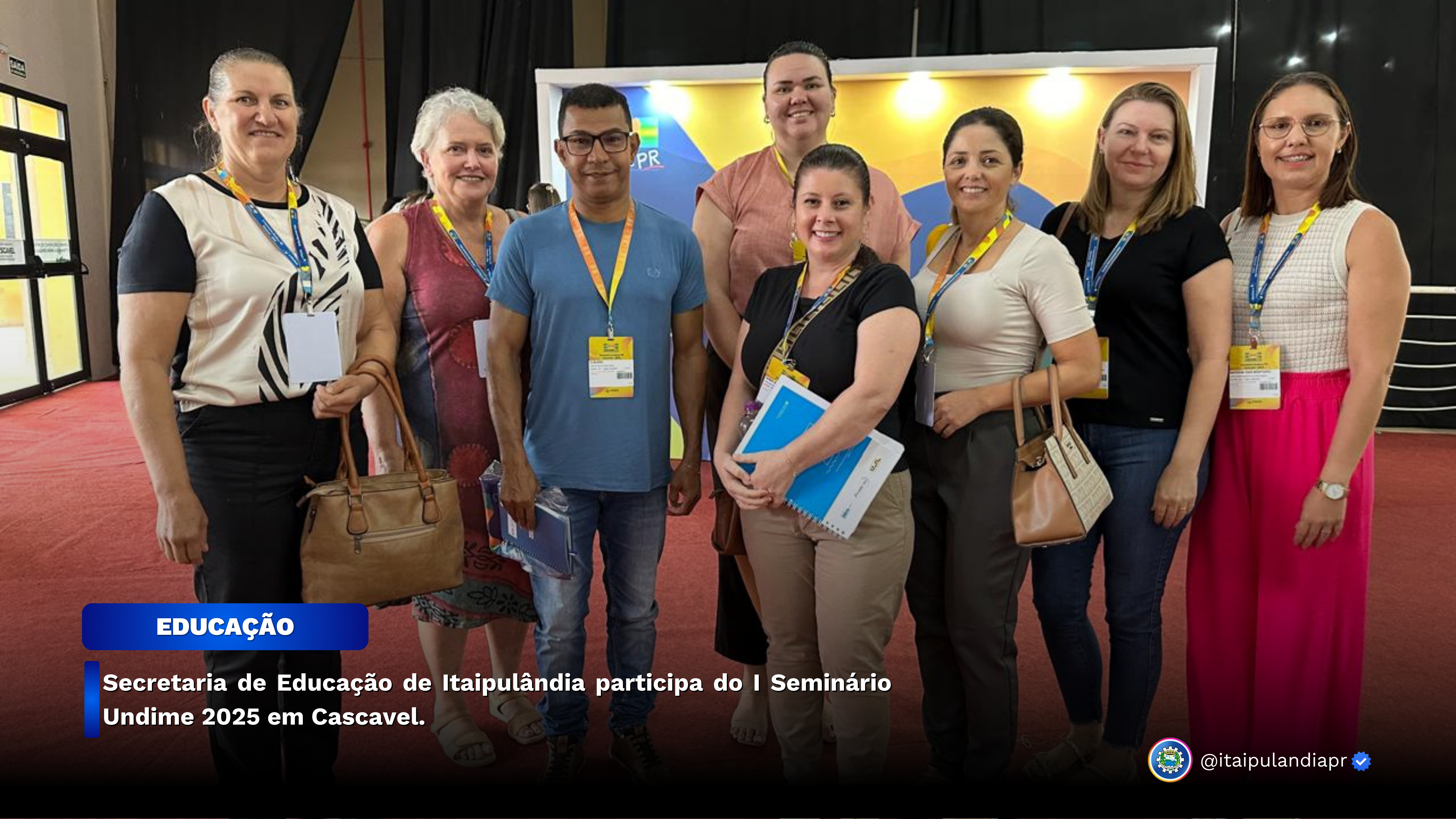 A Secretária de Educação de Itaipulândia, Verônica S. Rui, junto à assessores educacionais e técnicos da pasta, está participando do I Seminário Undime 2025 – Gestão Educacional: Planejando o Futuro da Educação Municipal, que acontece no Centro de Convenções e Eventos de Cascavel. O evento, iniciado na quarta-feira (26), segue até esta sexta-feira (28) e reúne dirigentes municipais de todo o Paraná para discutir os desafios e avanços na gestão educacional.