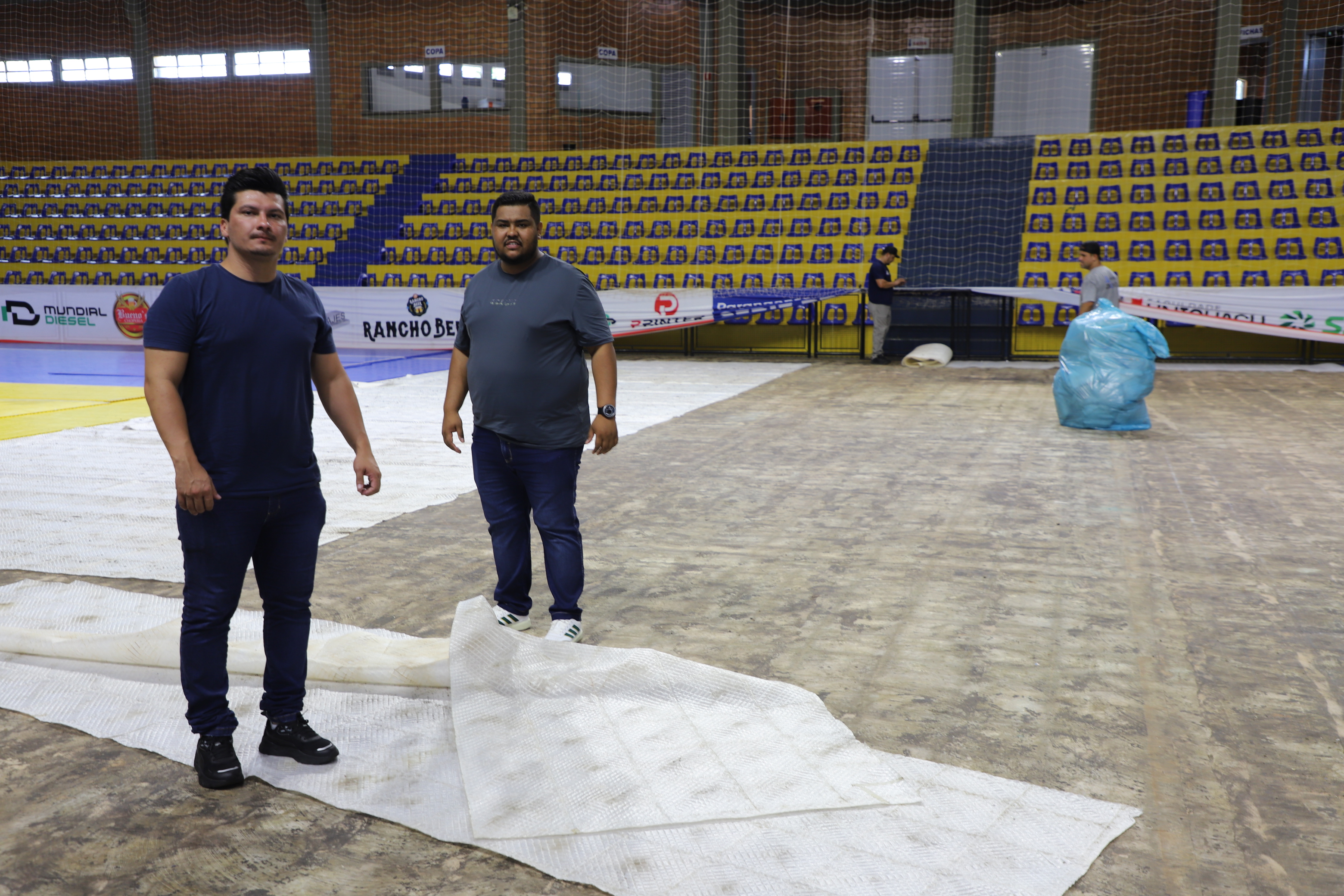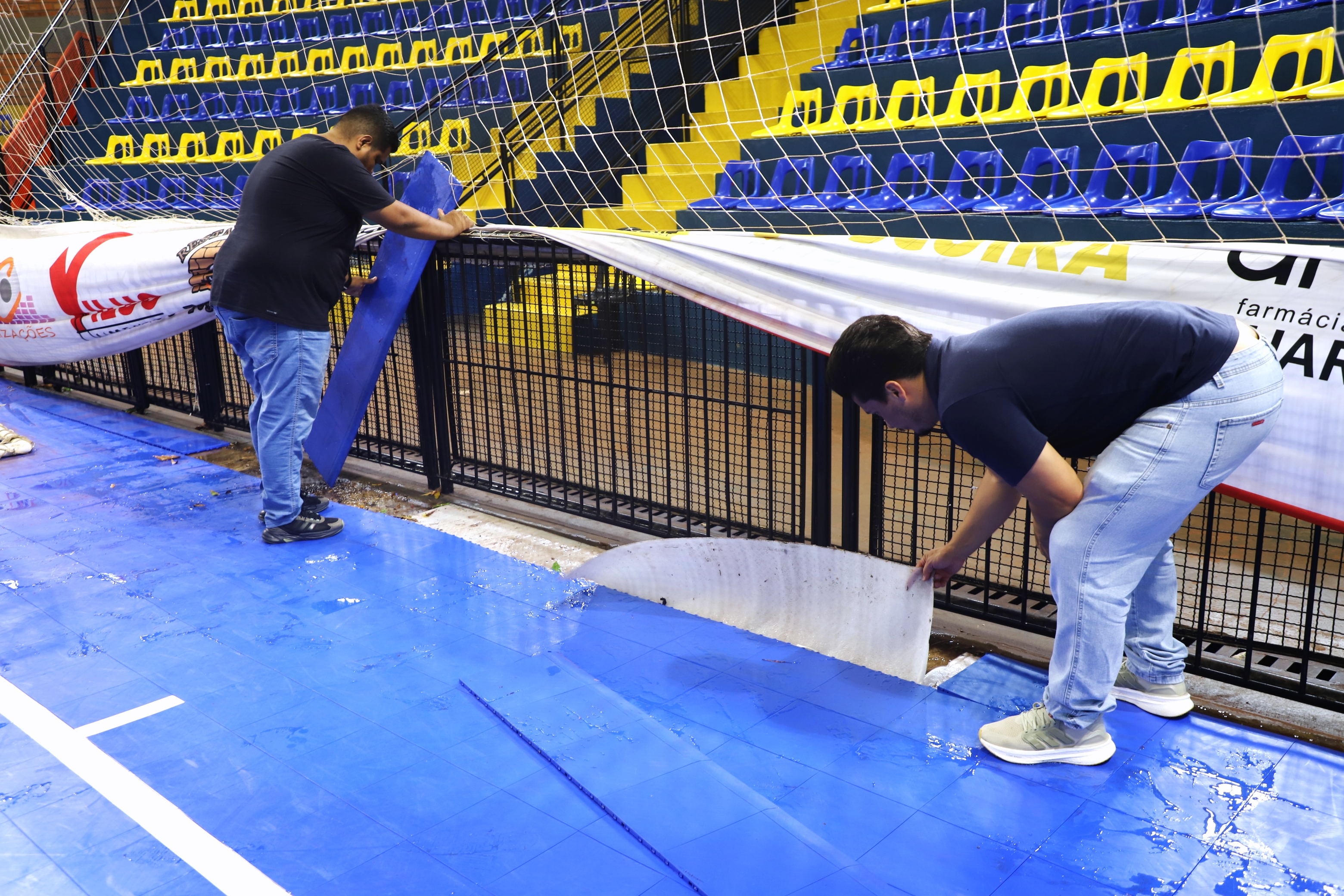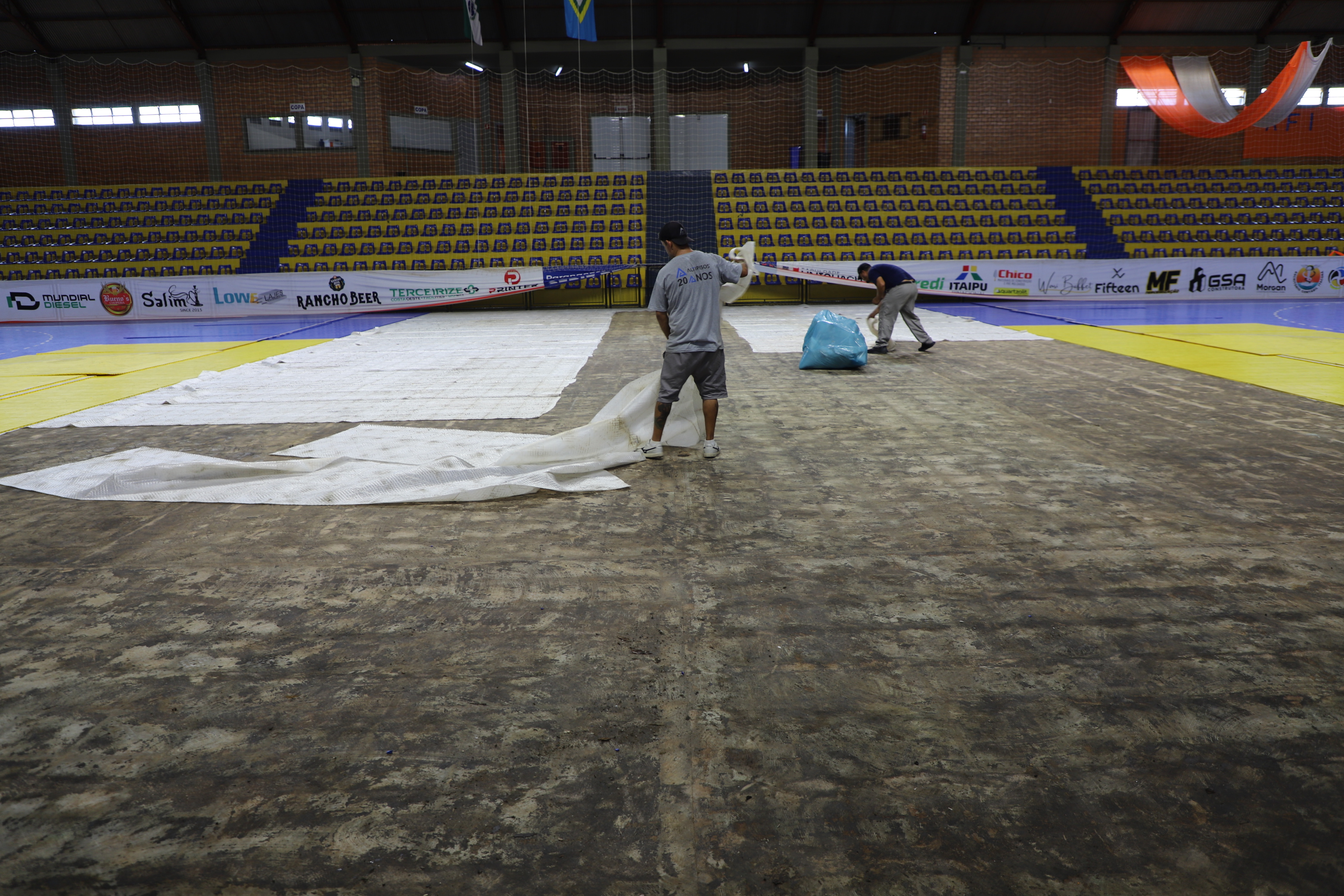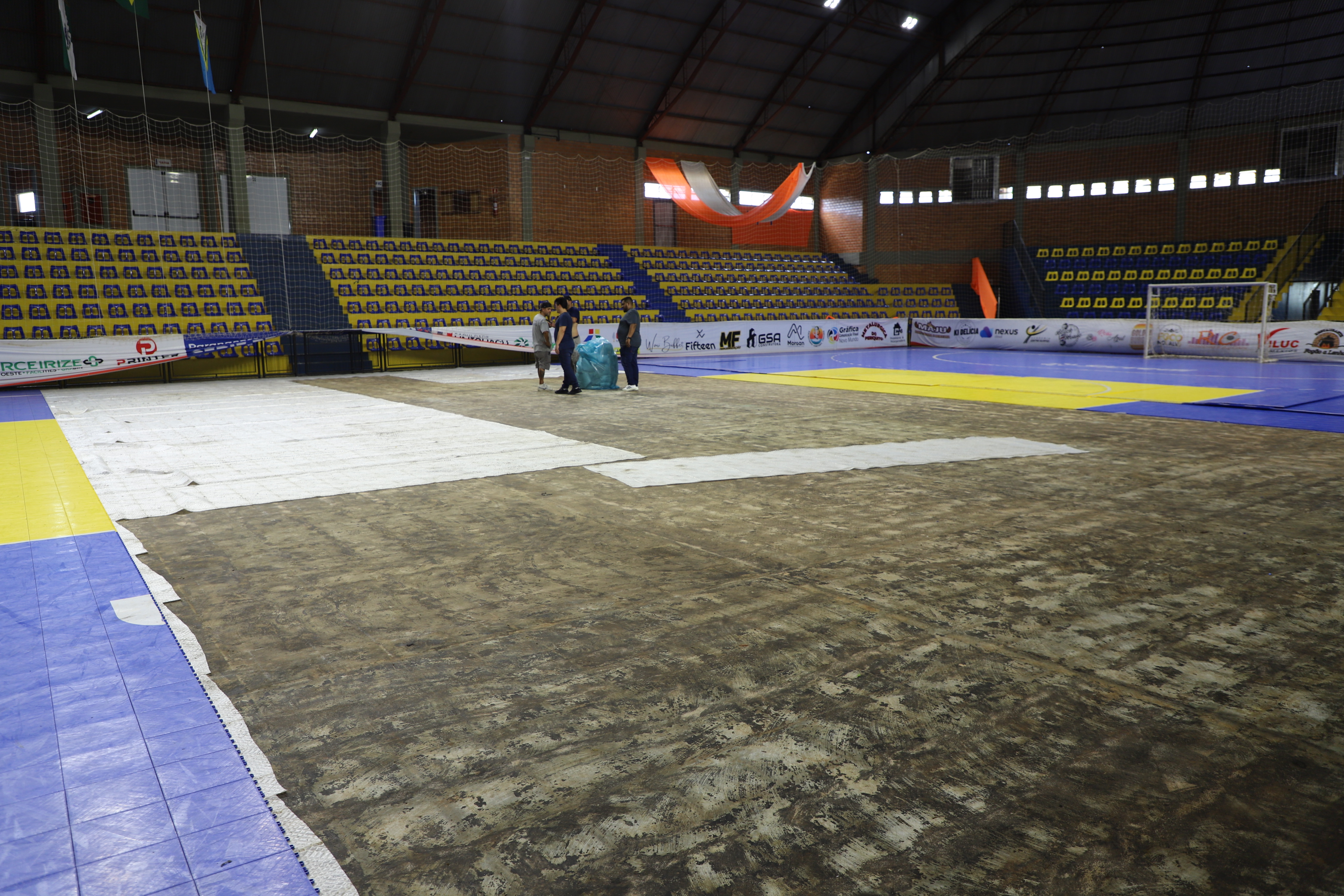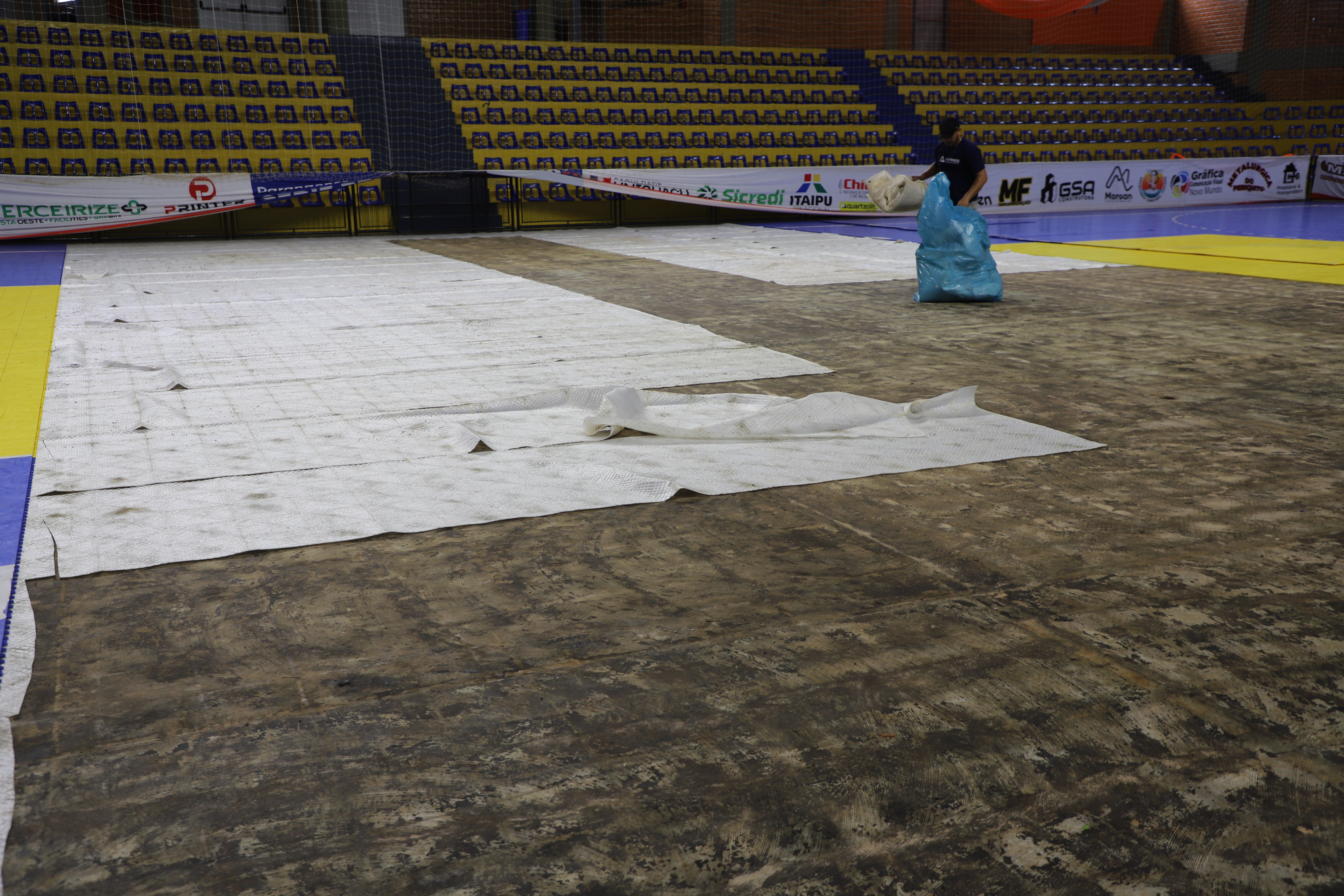 Após inundação do inÃcio do mês, manta do piso do Ginásio Municipal está sendo substituÃdo