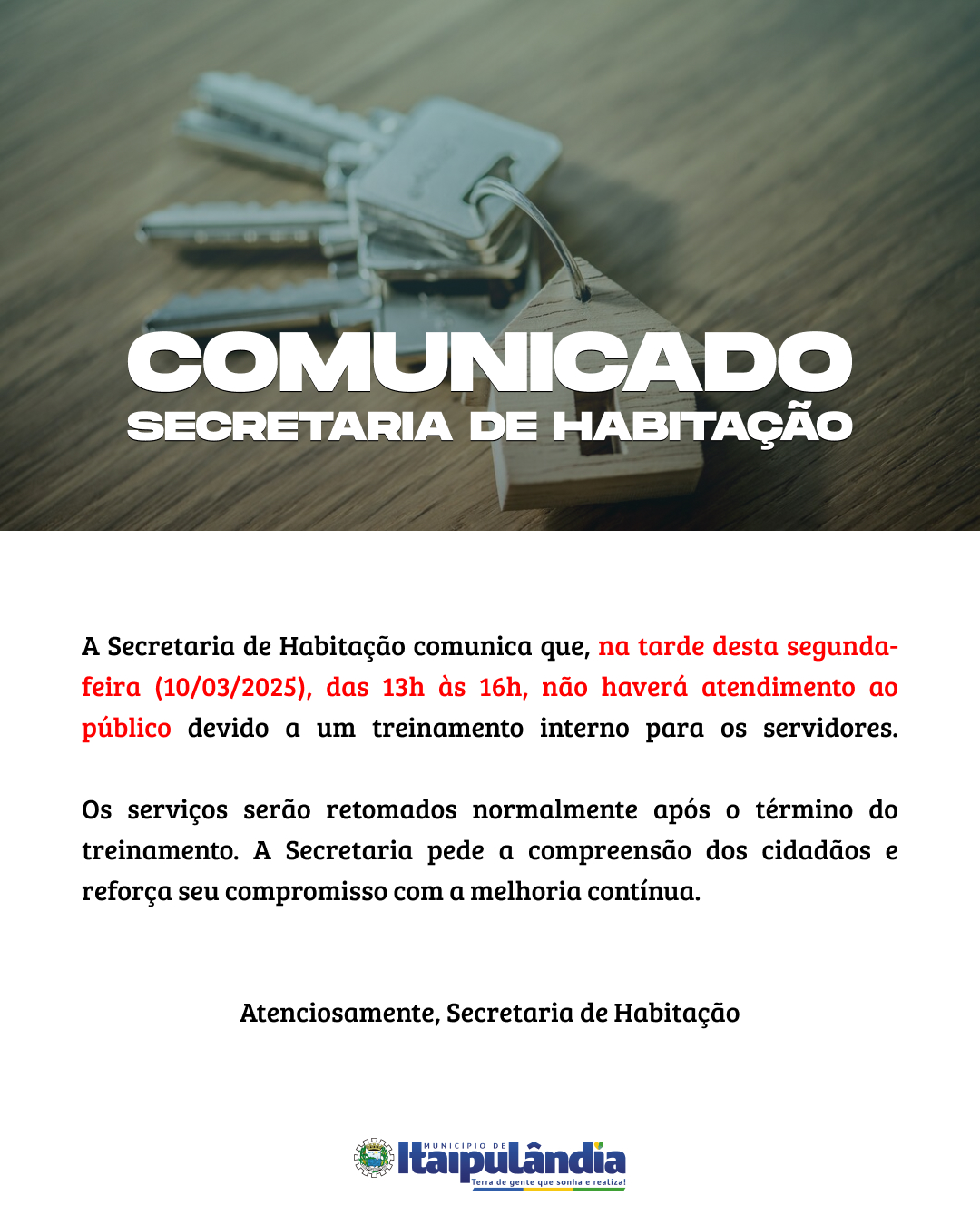 Atendimento suspenso da Secretaria de Habitação hoje, das 13h às 16h, para treinamento dos servidores. Agradecemos a compreensão!