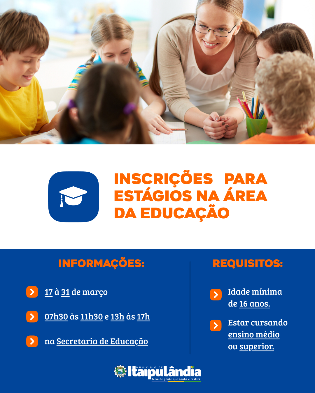 A Secretaria de Educação comunica que de 17 à 31/03 ocorrerá inscrições para estágios na área da educação. Inscrições na Secretaria de Educação das 07h30 às 11h30 e das 13h às 17h.