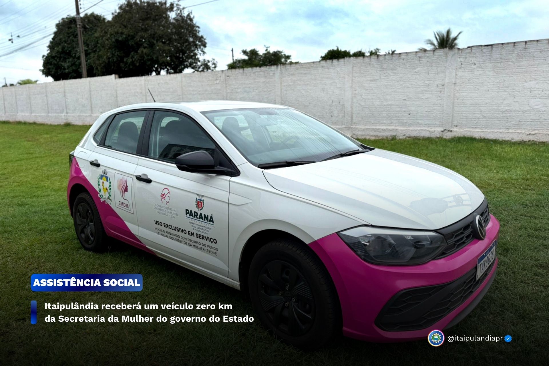 O município de Itaipulândia será contemplado com o repasse de um veículo Volkswagen Polo, 0 km, por parte do Governo do Estado, por meio da Secretaria de Estado da Mulher, Igualdade Racial e Pessoa Idosa.