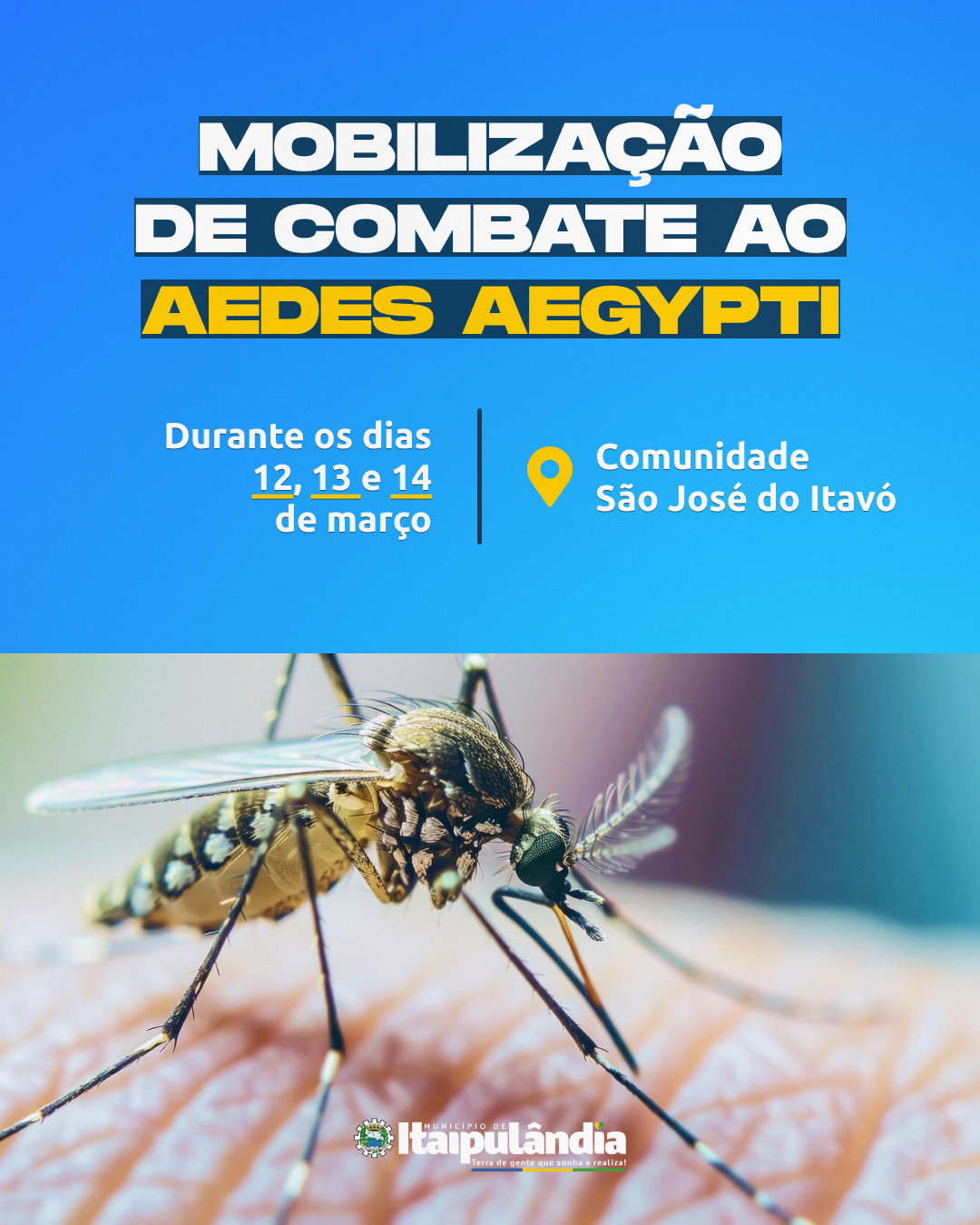 A Vigilância em Saúde, por meio do Departamento Ambiental, estará realizando uma Mobilização de Combate ao Aedes Aegypti, mosquito transmissor da Dengue, Zika e Chikungunya, nos dias 12, 13 e 14 de março na comunidade de São José do Itavó.