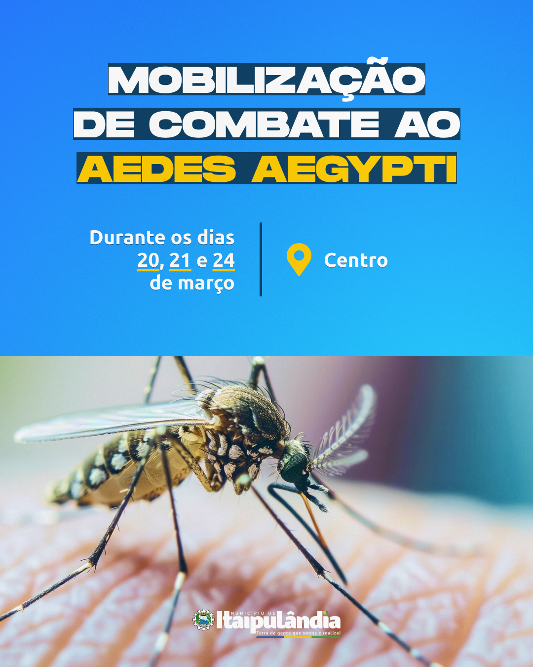 A Vigilância em Saúde, por meio do Departamento Ambiental, estará realizando uma Mobilização de Combate ao Aedes Aegypti, mosquito transmissor da Dengue, Zika e Chikungunya, nos dias 20, 21 e 24, de março no Centro.
