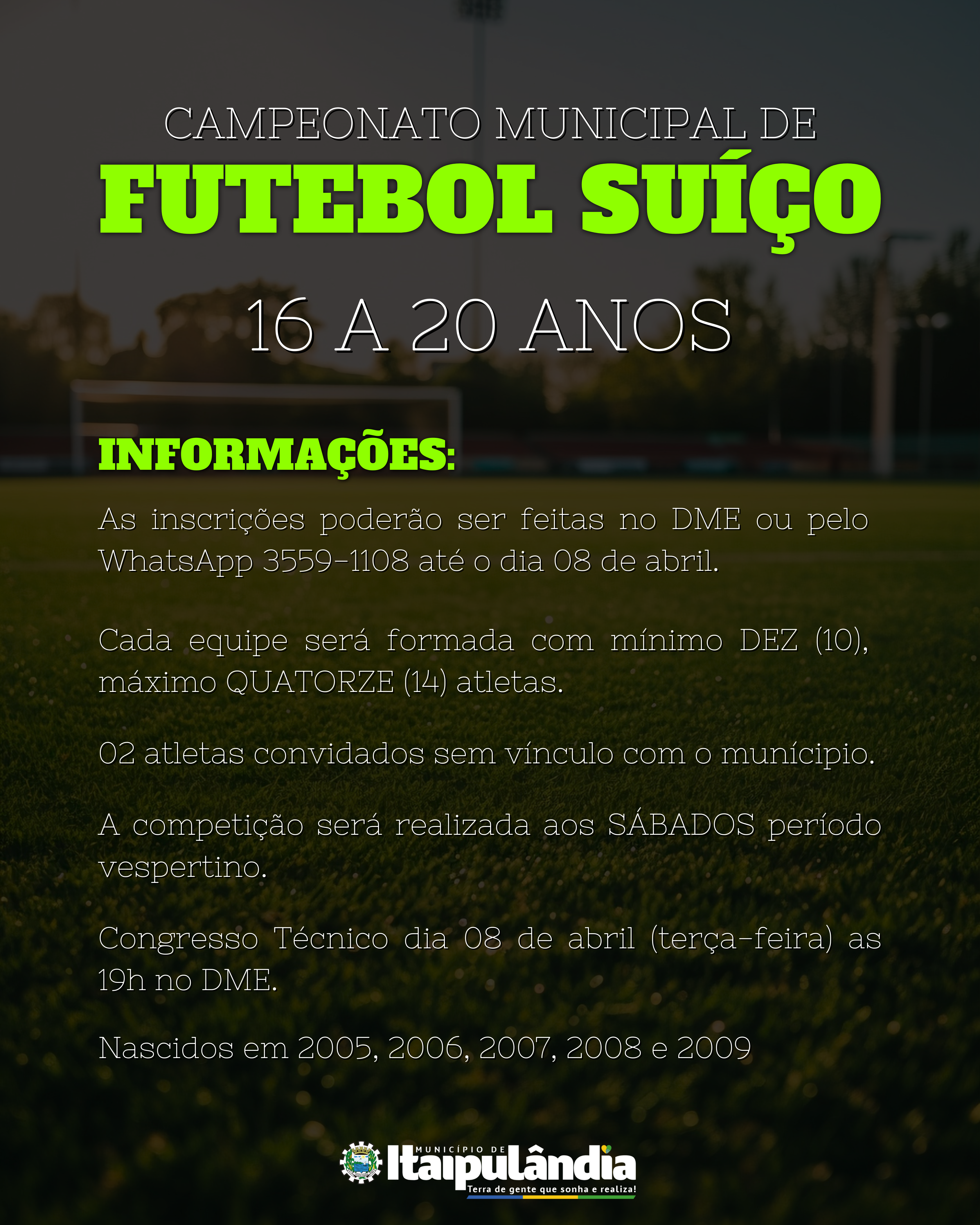 Para mais informações e ficha de inscrição, entre em contato com o Departamento de Esportes pelo telefone (45) 3559-1108.