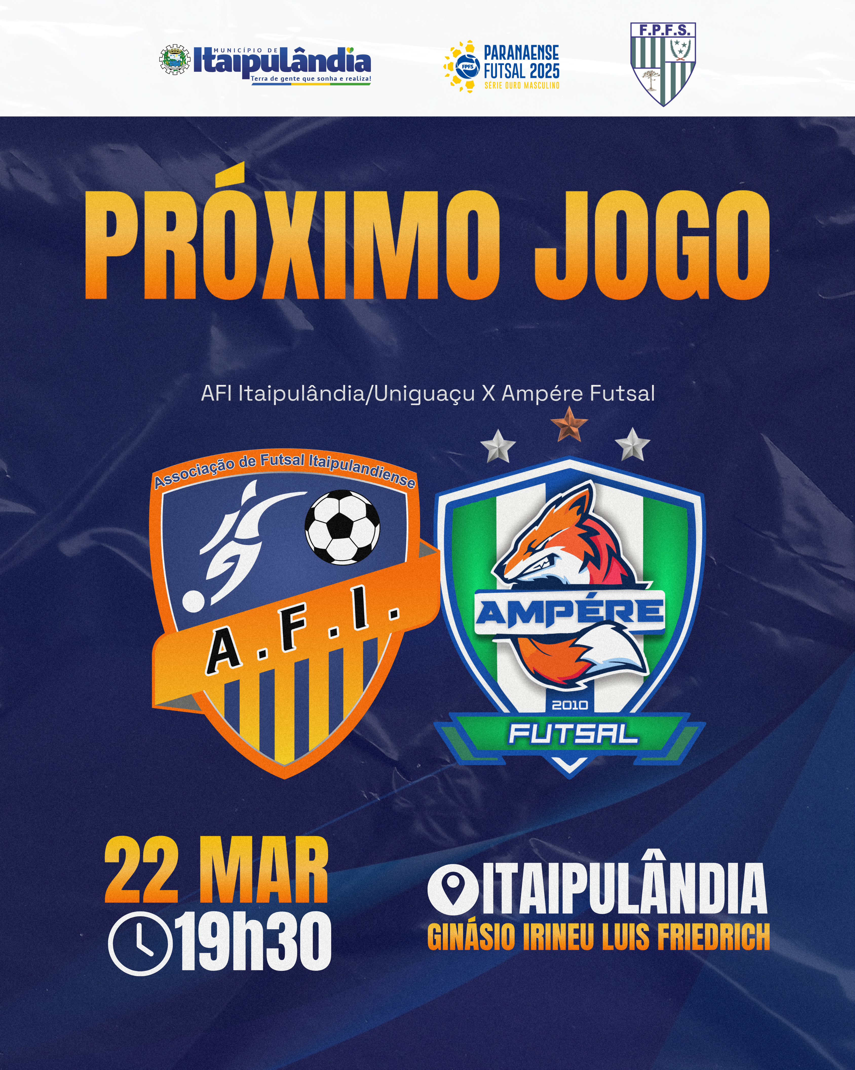 A AFI Itaipulândia Uniguaçu entra em quadra para mais um desafio na Série Ouro! 📍 Sábado, 22 de março | 19h30 🏟 Ginásio Irineu Luis Friedrich ⚽ Adversário: Ampére Futsal