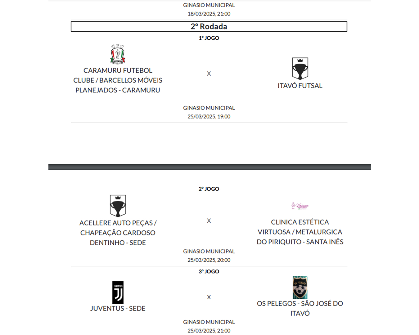 - Caramuru Futebol Clube/Barcellos Móveis Planejados – Caramuru X Itavó Futsal - Acellere Auto peças/Chapeação Cardoso Dentinho – Sede X Clínica Estética Virtuosa/Metalúrgica do Piriquito – Santa Inês - Juventus – Sede X Os Pelegos