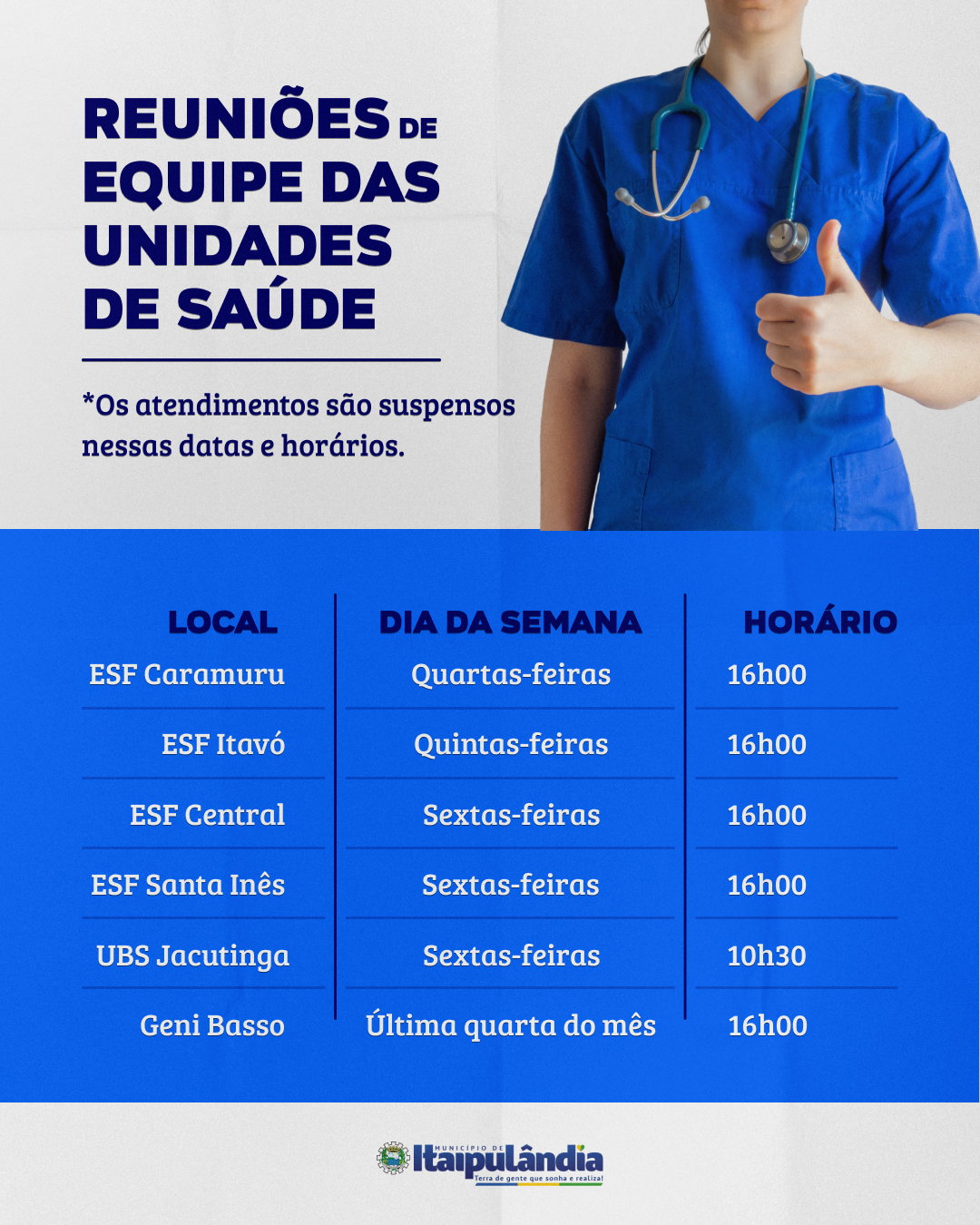 A Secretaria de Saúde anunciou o cronograma de reuniões de equipe, o que resultará na suspensão dos atendimentos nas datas e horários definidos.
