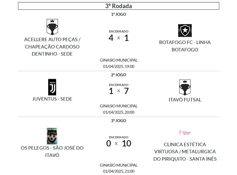 - Acellere Auto peças/Chapeação Cardoso Dentinho – Sede 04 X 01 Botafogo FC – Linha Botafogo - Juventus – Sede 01 X 07 Itavó Futsal – São José do Itavó - Os Pelegos – São José do Itavó 00 x 10 Clínica Estética Virtuosa/Metalúrgica do Piriquito – Santa Inês - FOLGA: Caramuru Futebol Clube/Barcellos Móveis Planejados – Caramuru.
