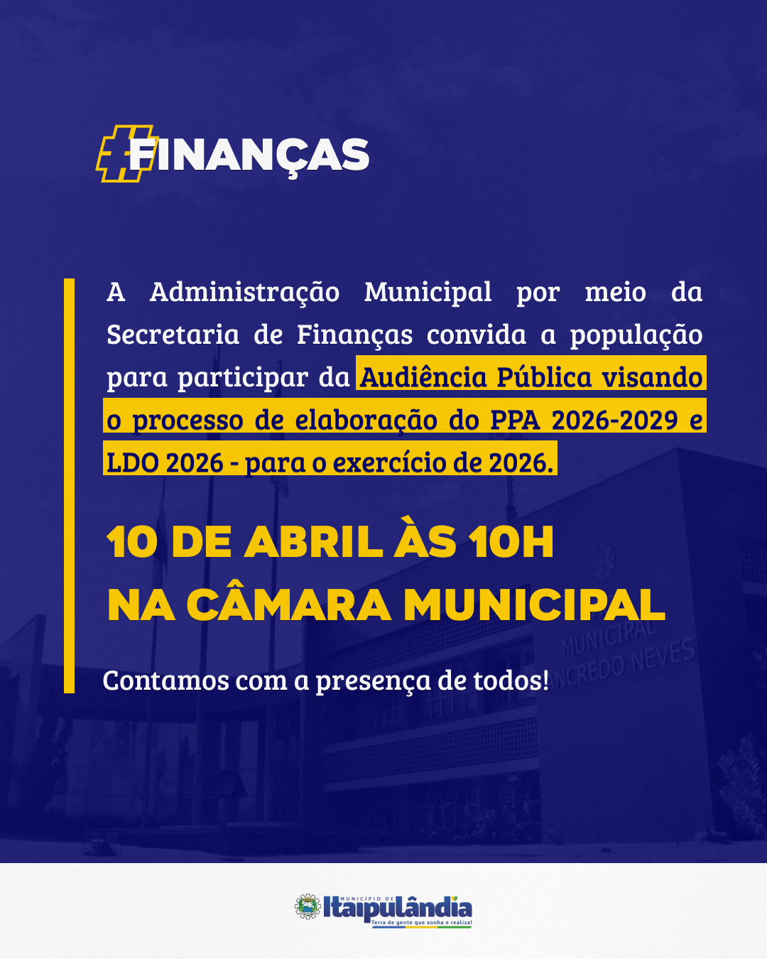 Audiência Pública visando o processo de elaboração do PPA 2026-2029 e LDO 2026 - para o exercício de 2026., dia 10/04 às 10h no Plenário da Câmara Municipal.