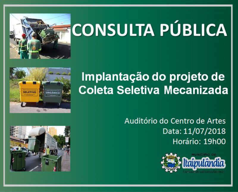Acontecerá amanhã no auditório do Centro de Artes a consulta pública sobre a implantação do projeto de coleta seletiva mecanizada às 19 horas.