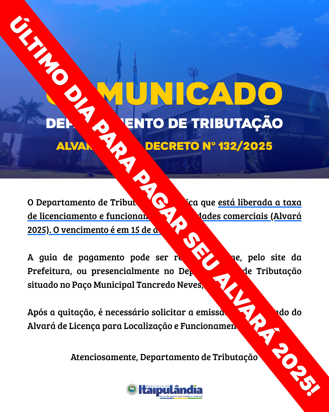 Hoje, 15 de abril, vence a taxa do Alvará 2025. Retire sua guia online no site da Prefeitura ou no Departamento de Tributação.