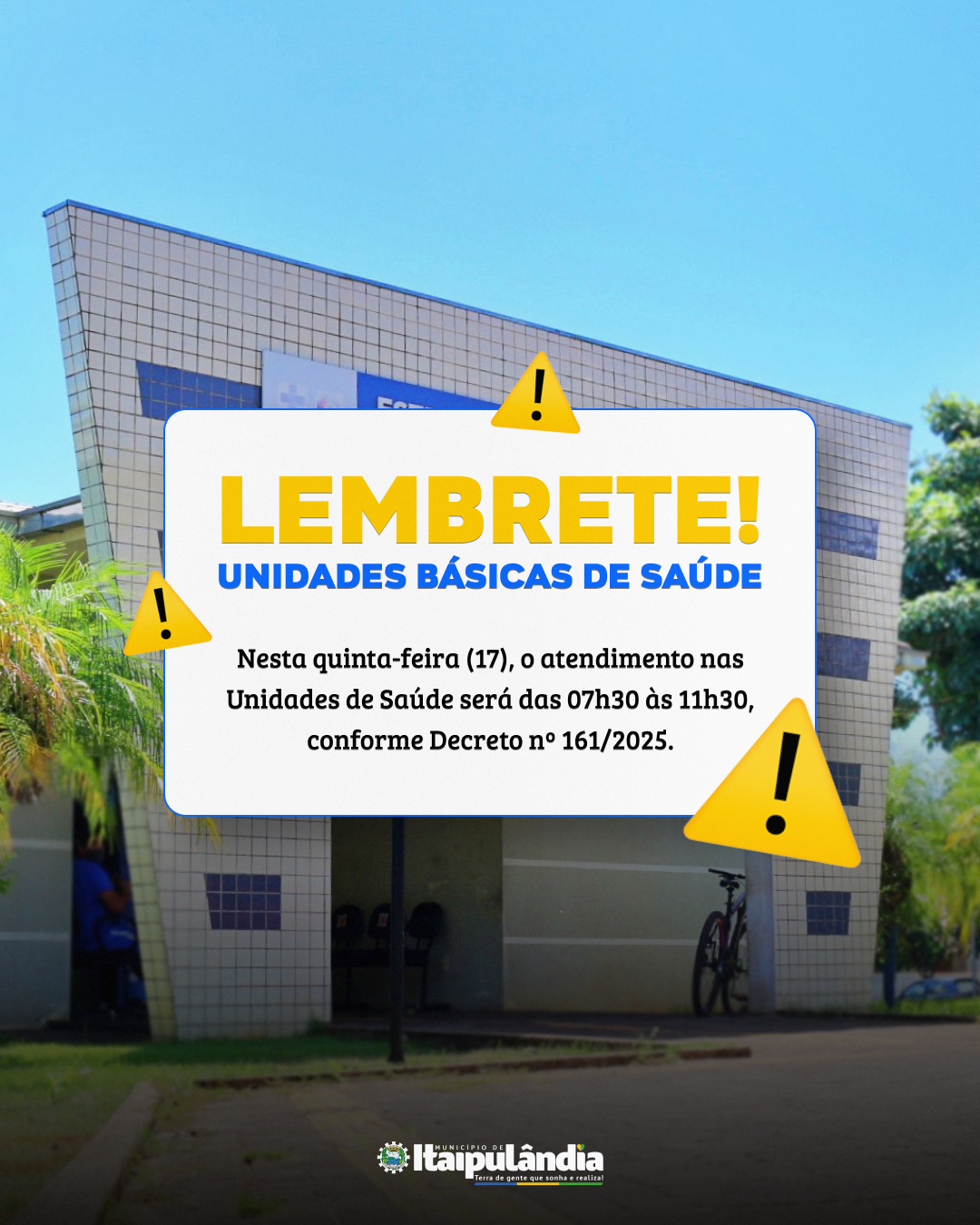 Conforme o Decreto nº 161/2025, o atendimento nas Unidades de Saúde nesta quinta-feira (17), será realizado em horário especial: das 07h30 às 11h30.