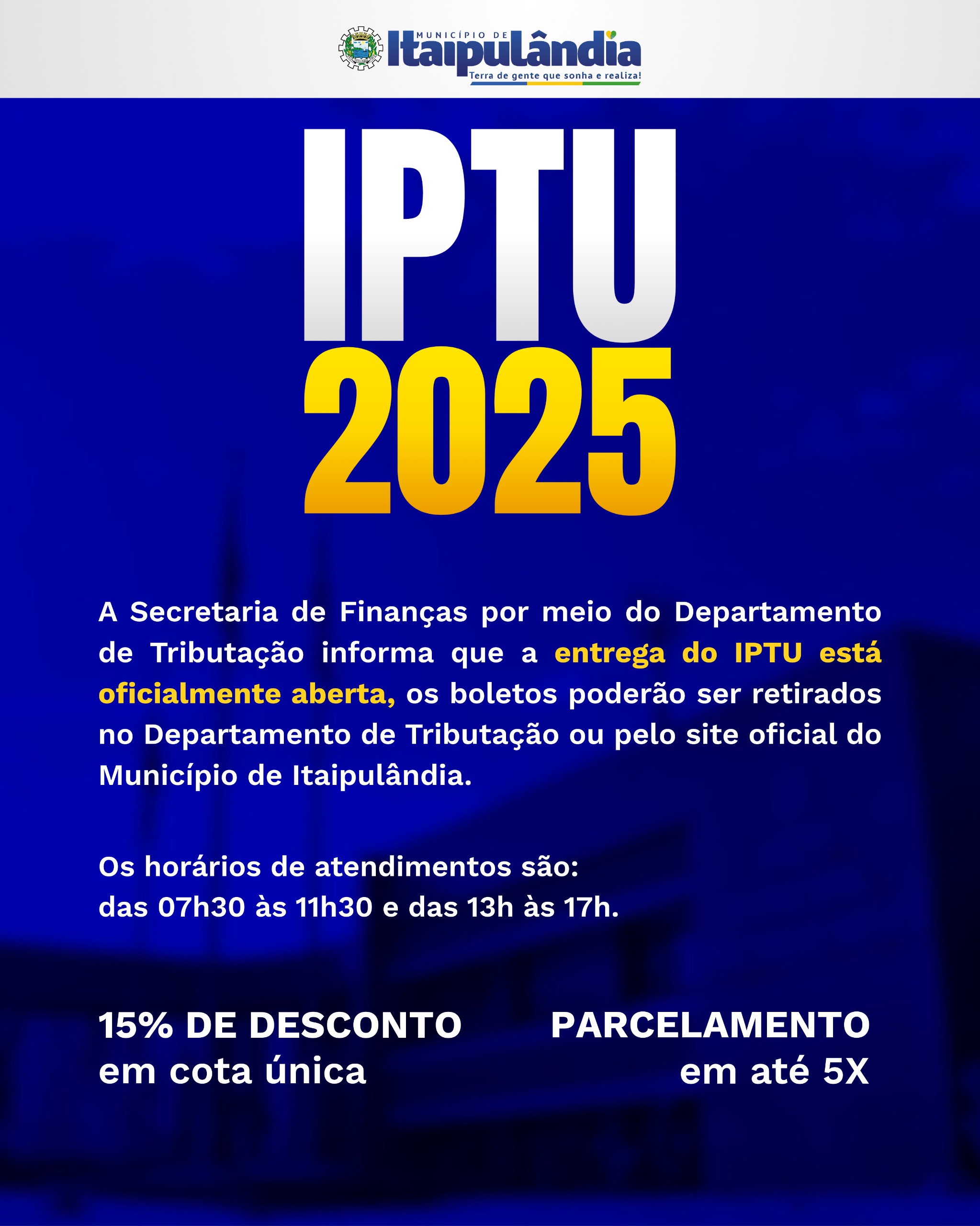 Retire seu boleto de forma online, no site da Prefeitura de Itaipulândia, ou diretamente no Departamento de Tributação, de segunda à sexta das 07h30 às 11h30 e das 13h às 17h.