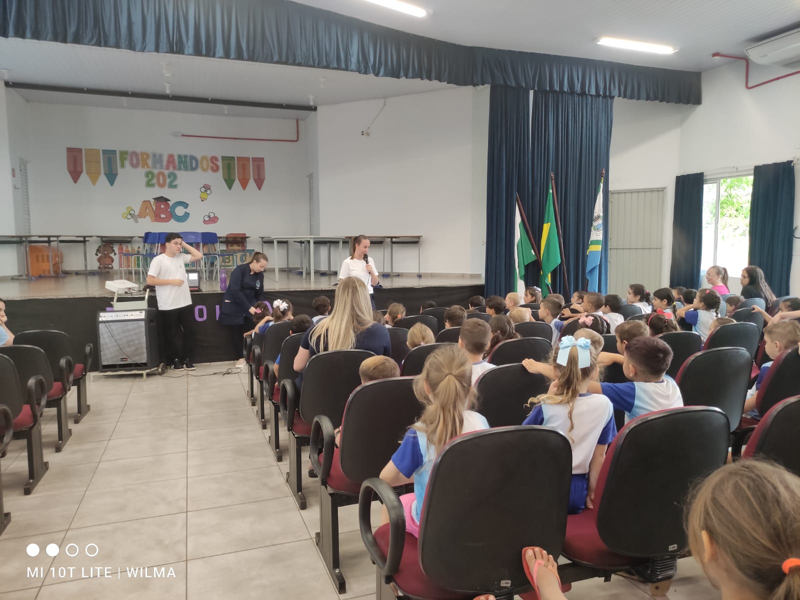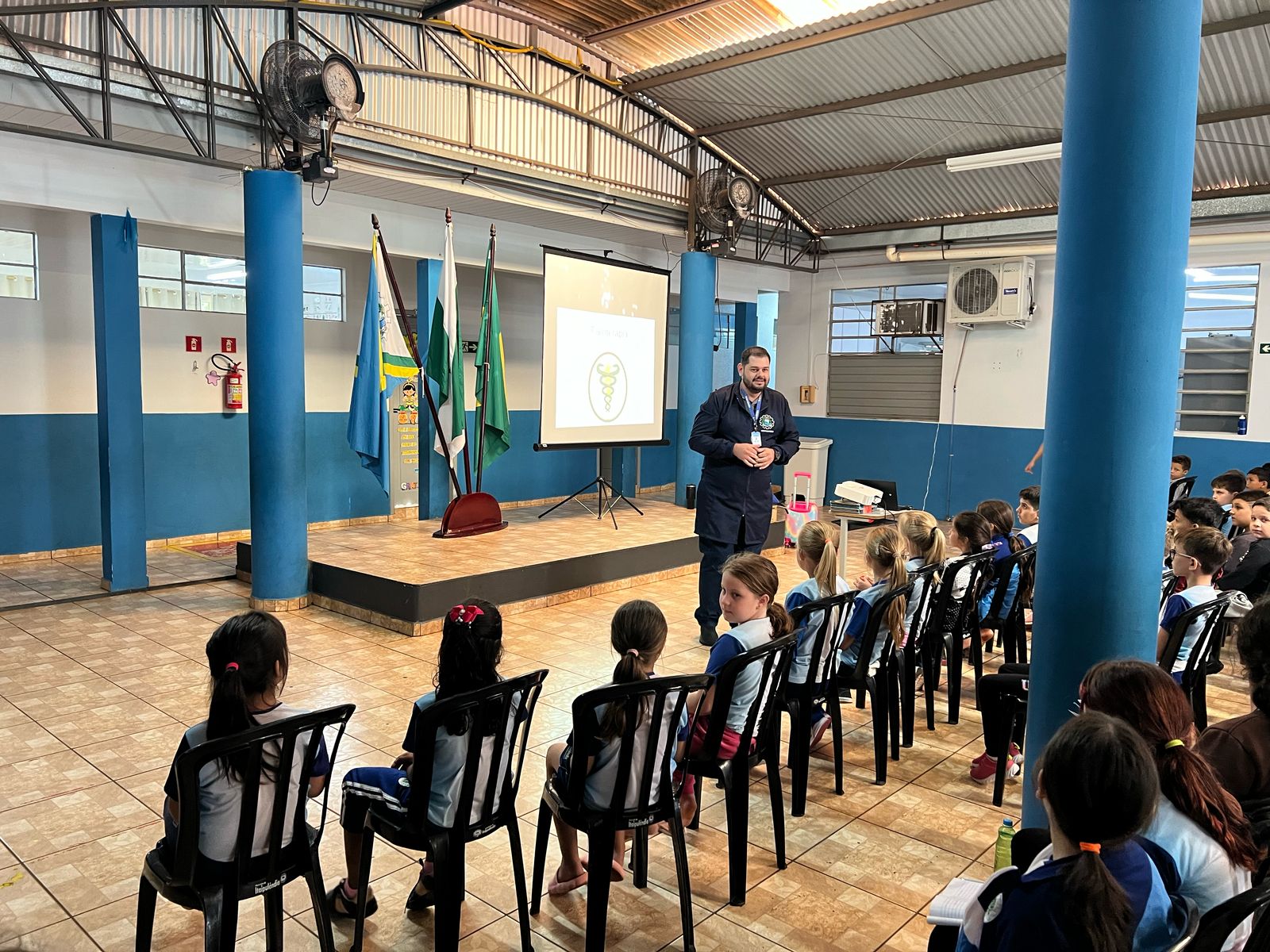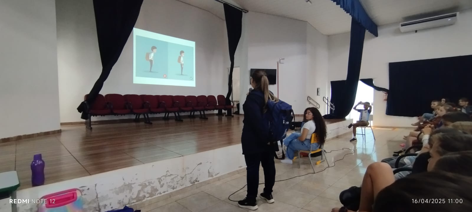 As orientações foram conduzidas pelos fisioterapeutas Adriane Balen, Jaqueline Vasconcelos, Ilonei Matthes e Patricia Falcão, que ensinaram aos alunos a postura correta ao sentar-se nas carteiras e a forma adequada de carregar mochilas.