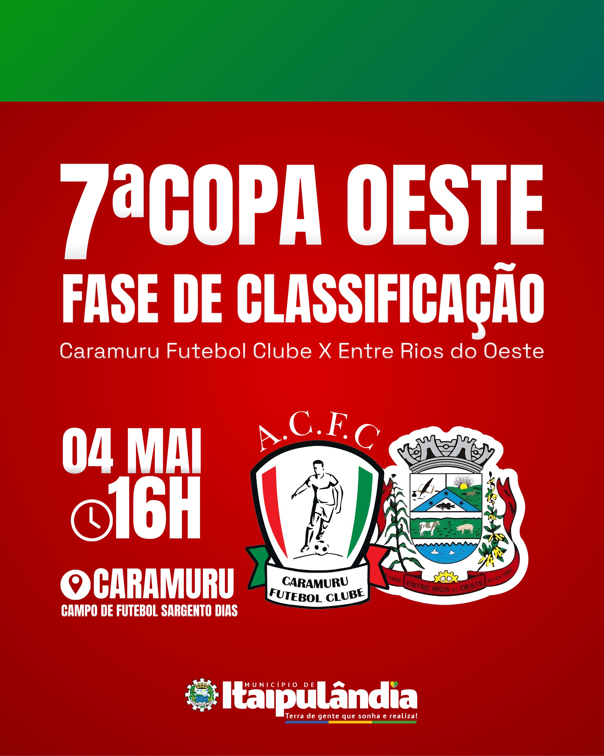 Copa Oeste de Futebol04/05/2025 - Município de Itaipulândia/Caramuru F.C X Entre Rios do OesteCampo de Futebol Sargento Dias – Itaipulândia – 16h.