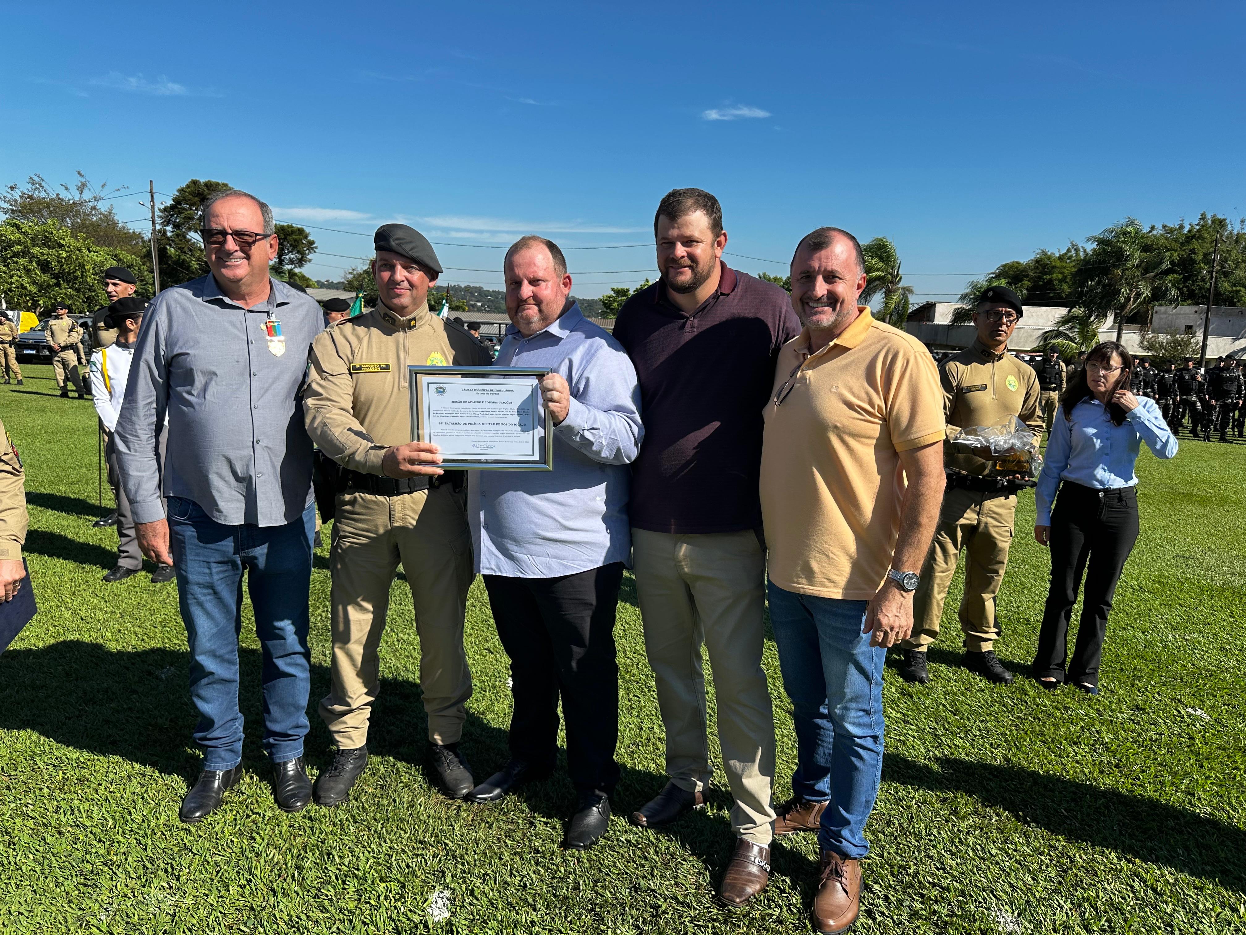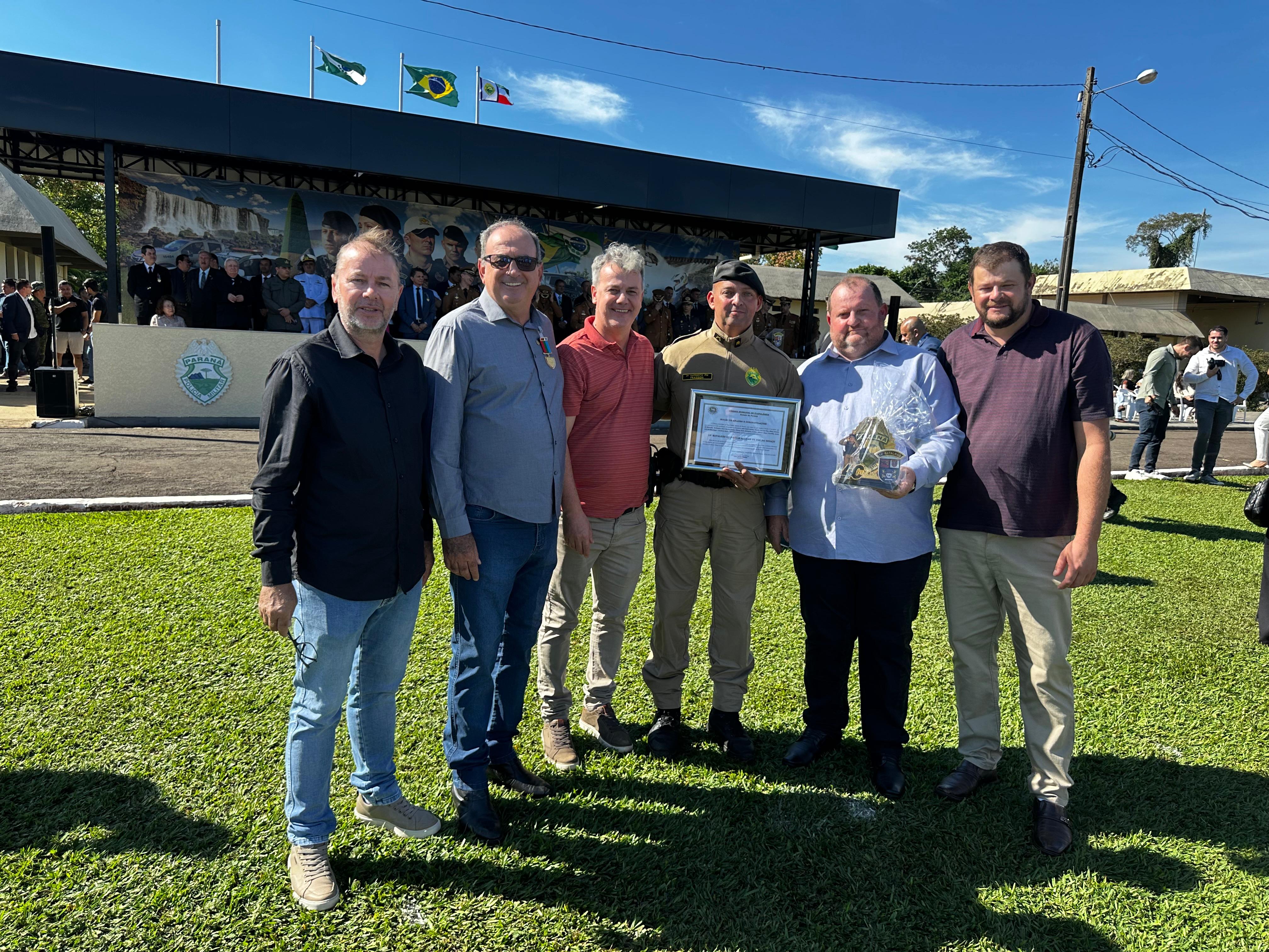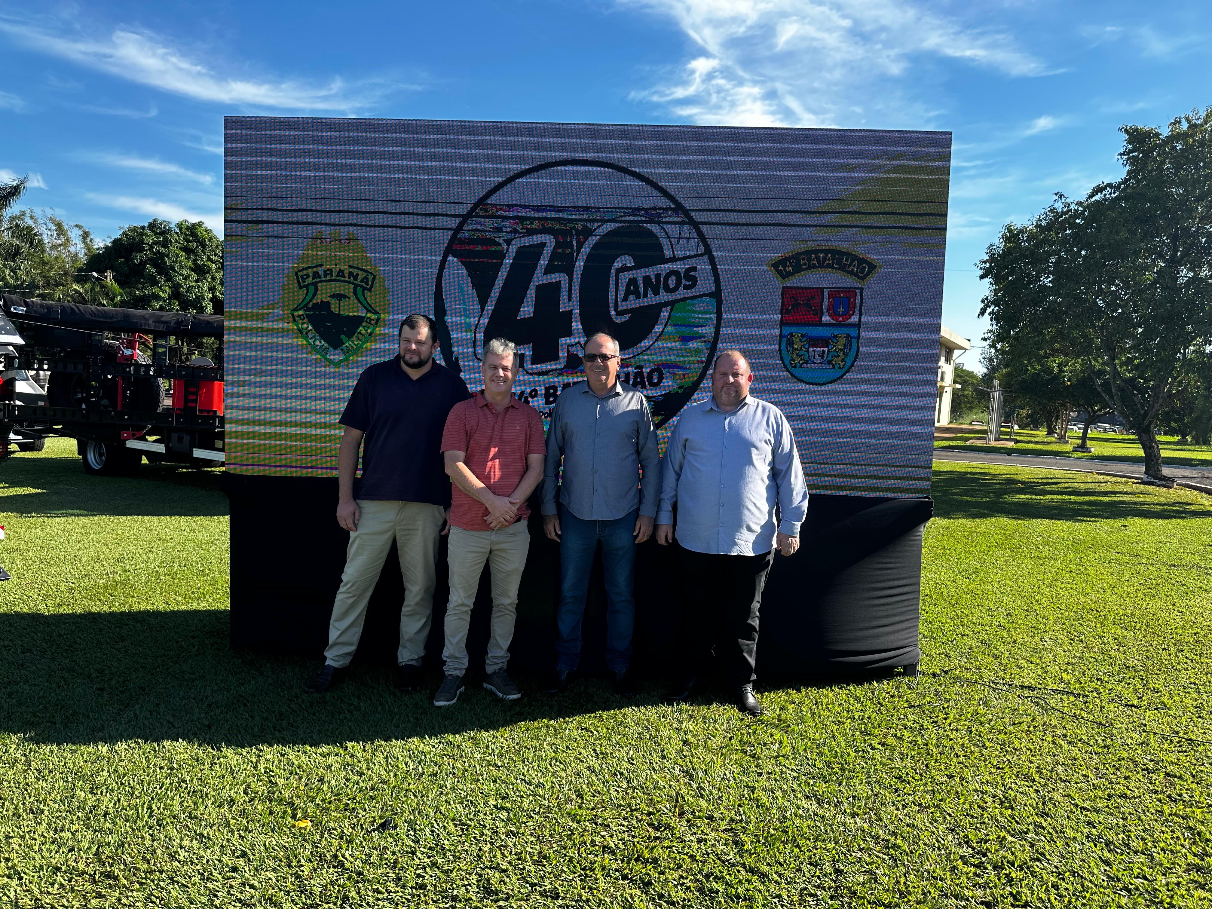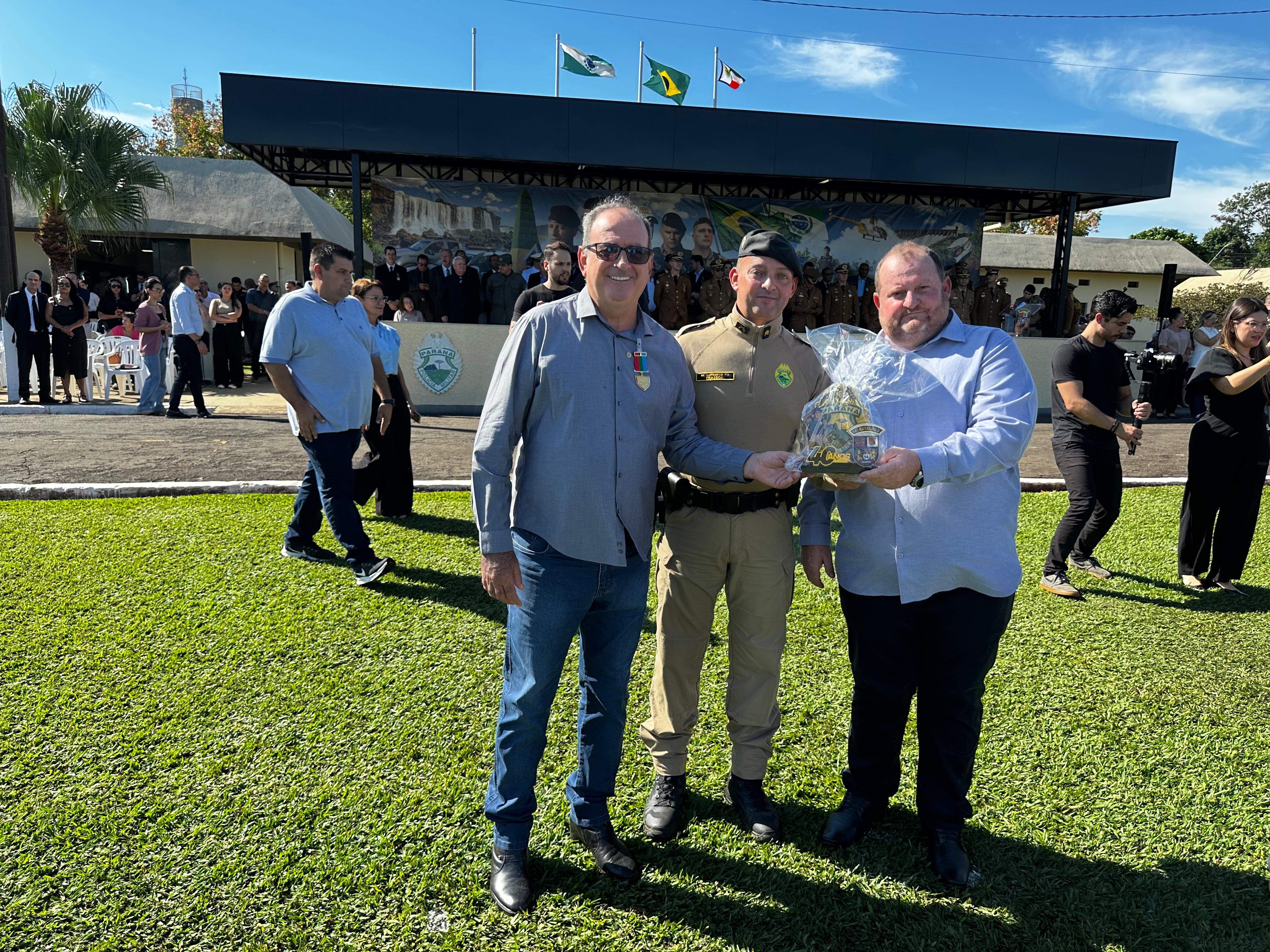 Na quinta-feira (8), a convite do comandante do 14º Batalhão da Polícia Militar de Foz do Iguaçu, Coronel Márcio Skovronski, o Prefeito Lindolfo Martins Rui participou da solenidade em comemoração aos 40 anos de fundação do Batalhão. O evento reuniu diversas autoridades civis e militares e celebrou a história de dedicação e serviço prestado pela corporação à população da região trinacional.