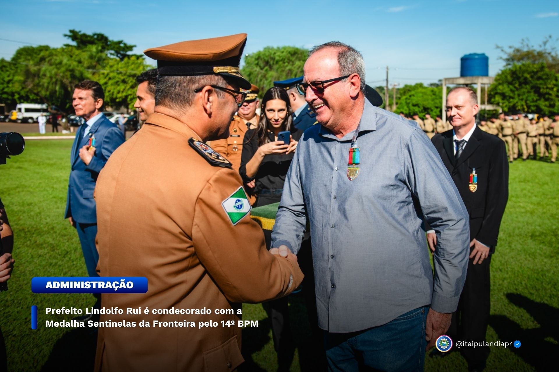 Durante a cerimônia, o Prefeito foi homenageado e recebeu a Medalha Sentinelas da Fronteira, uma honraria concedida a personalidades que se destacam por seus relevantes serviços em áreas de fronteira. Lindolfo Martins Rui foi um dos três Prefeitos da região de abrangência do 14º BPM à receber a homenagem.