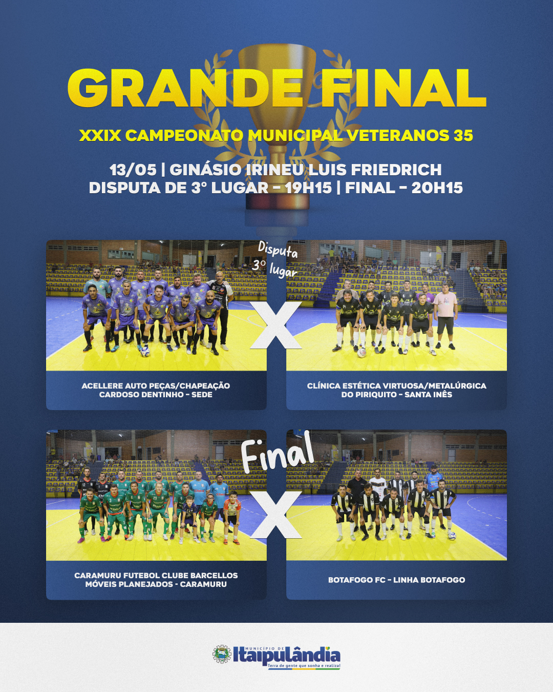 Disputa de 3º lugar – 19h15Acellere Auto Peças/Chapeação Cardoso Dentinho (Sede) X Clínica Estética Virtuosa/Metalúrgica do Piriquito (Santa Inês)