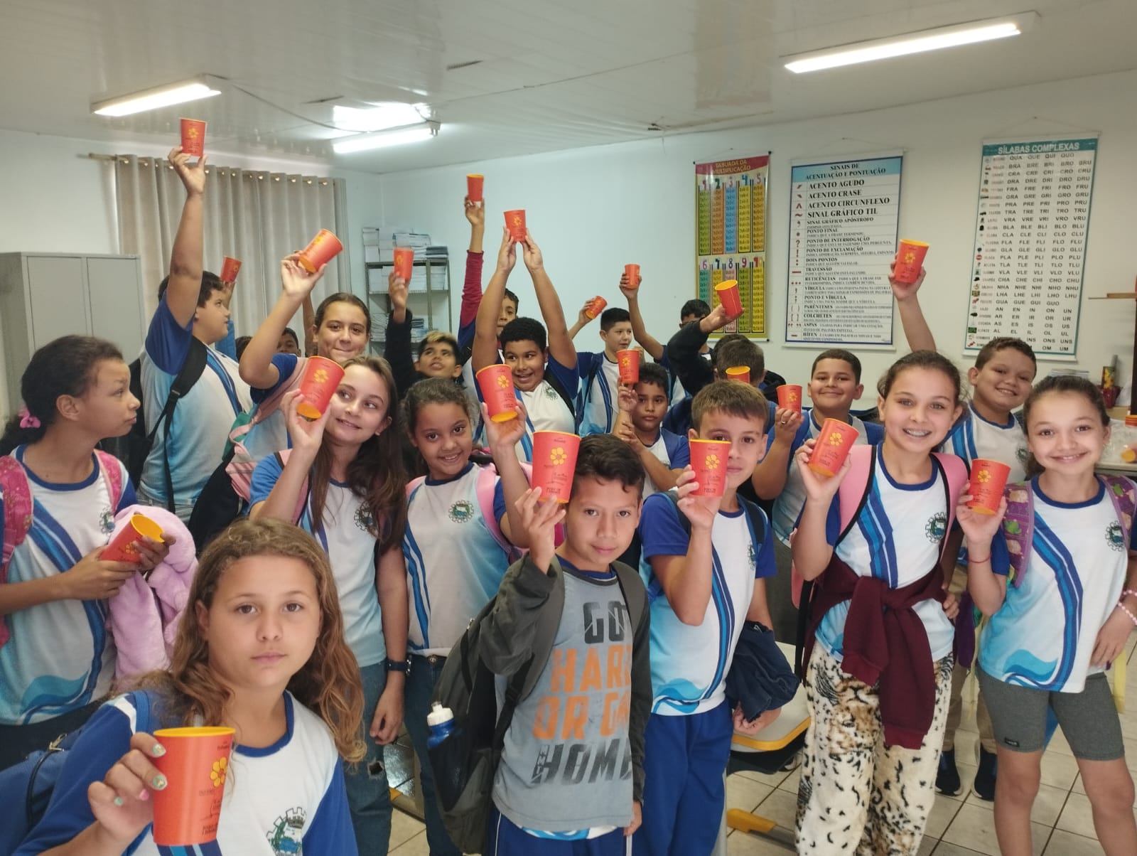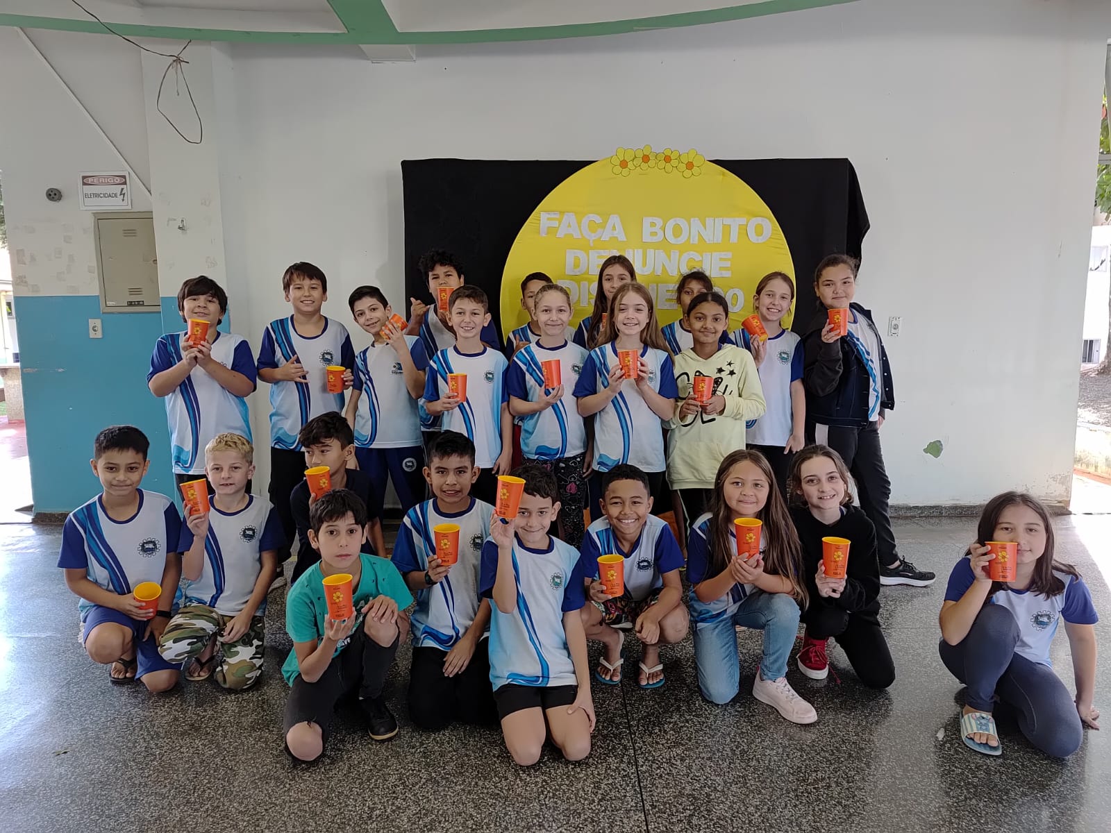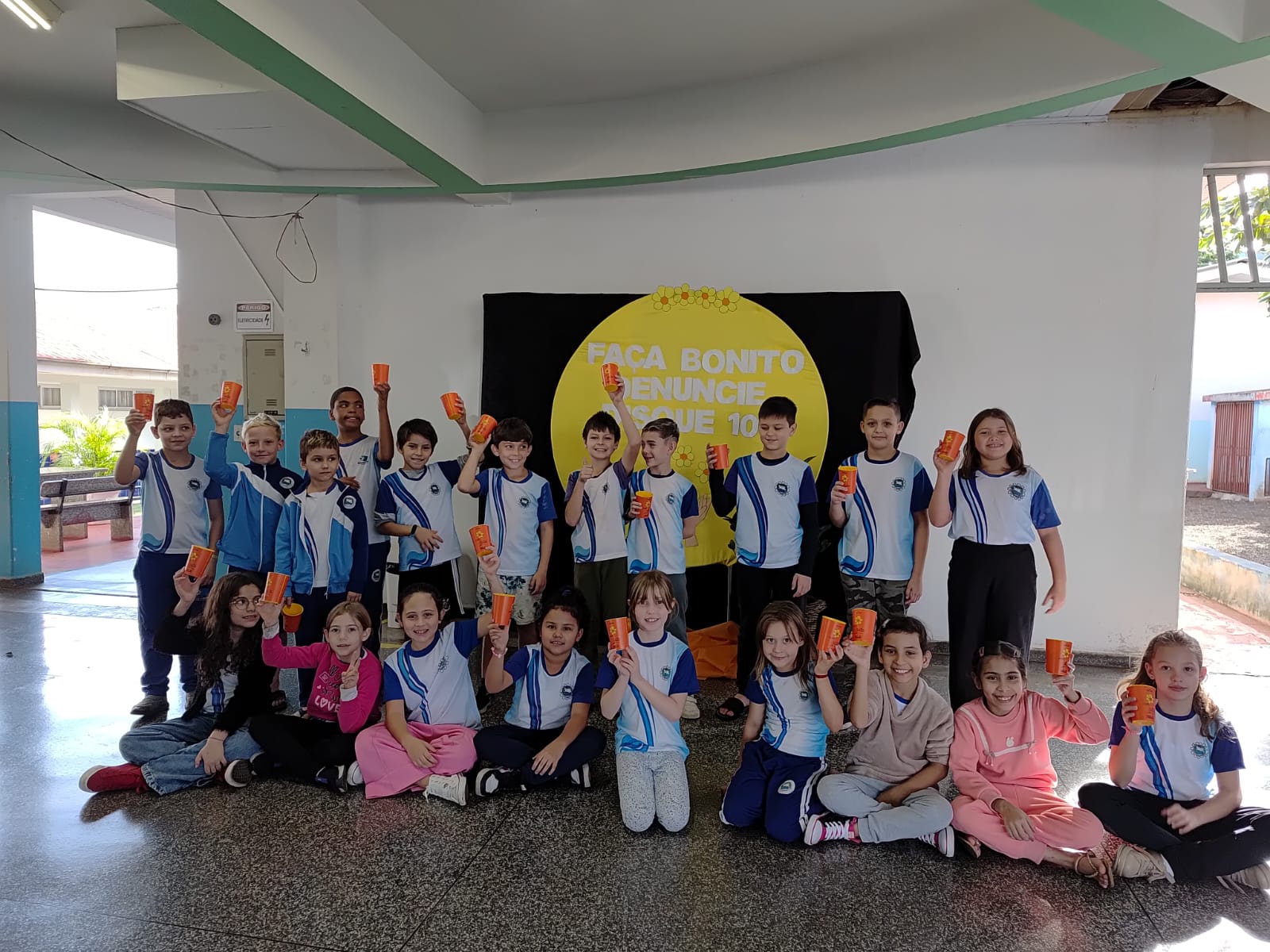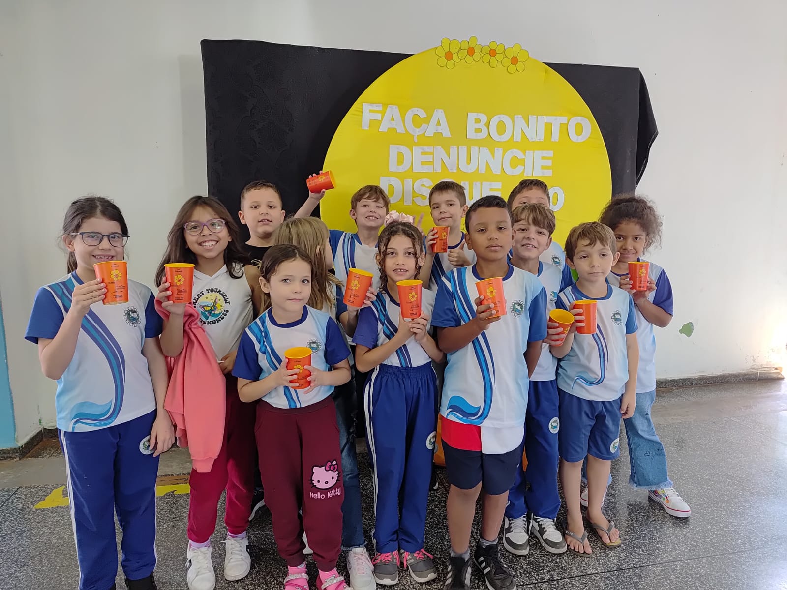 Alunos da rede municipal recebem copos da Campanha Maio Laranja em ação com a Frivatti