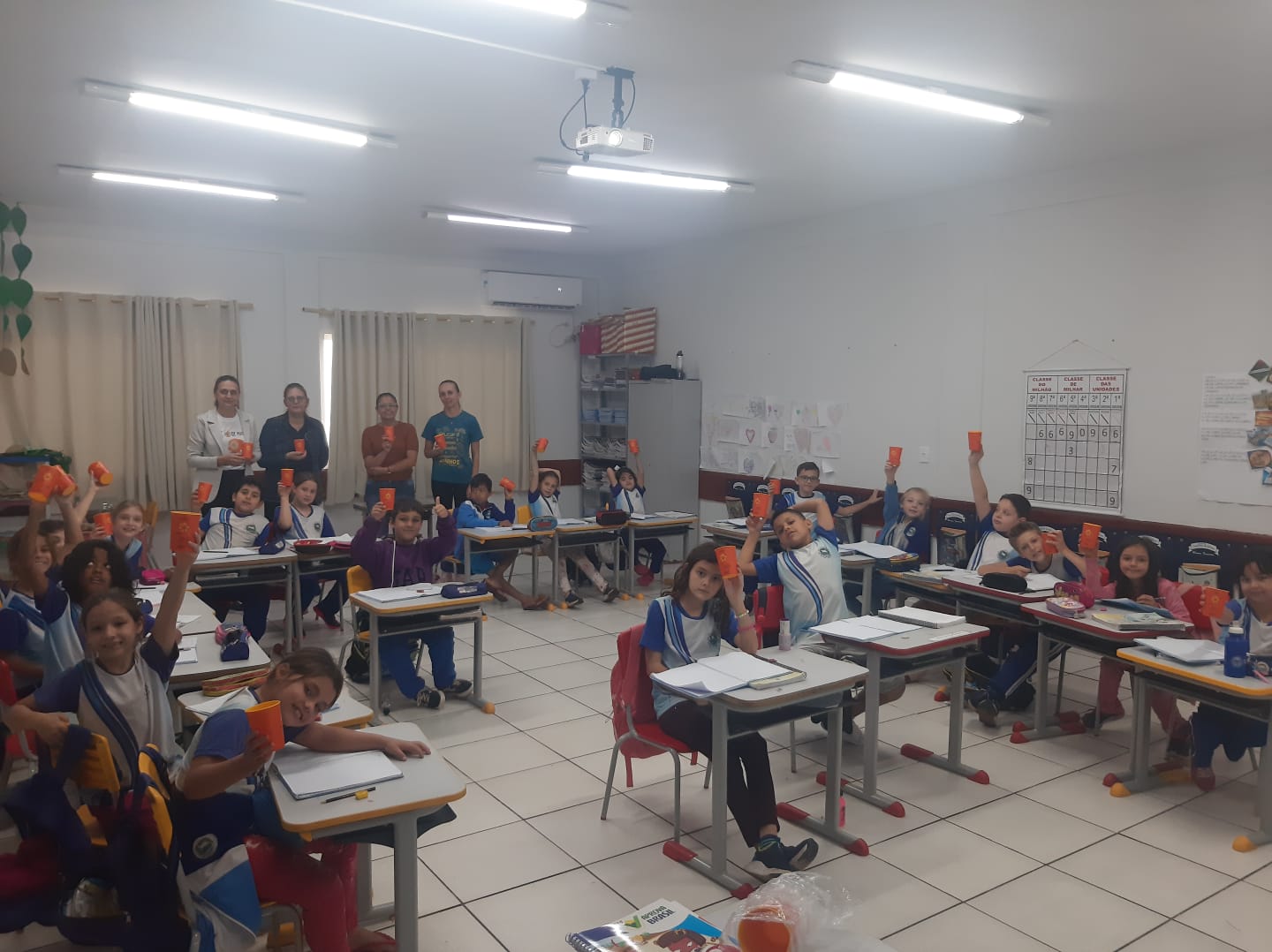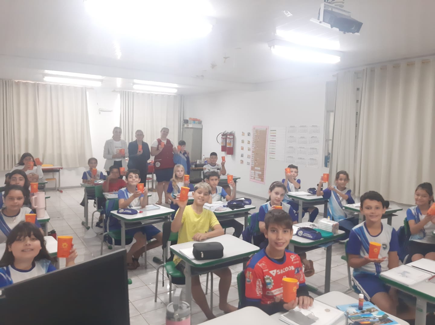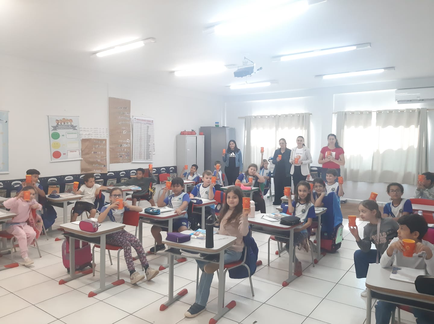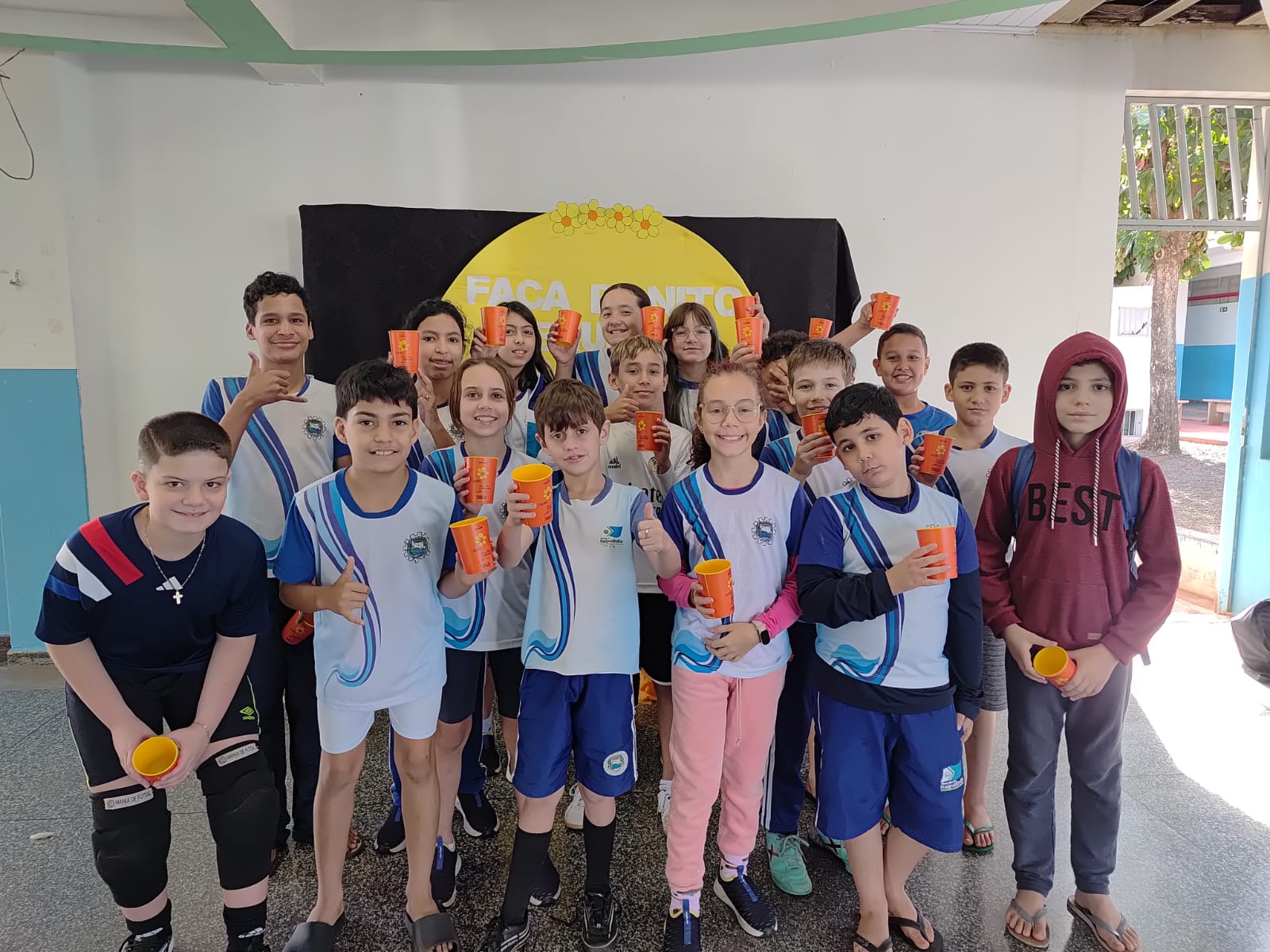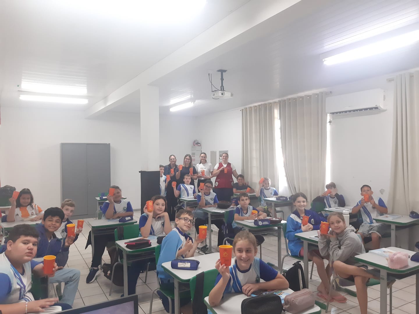 Alunos da rede municipal recebem copos da Campanha Maio Laranja em ação com a Frivatti