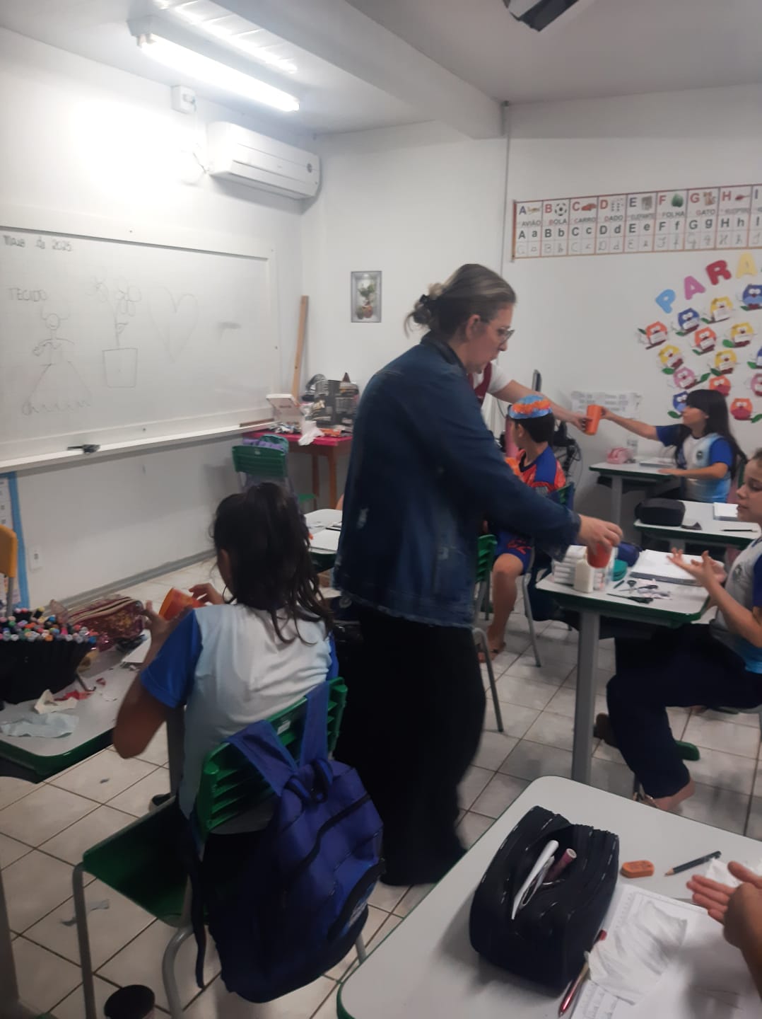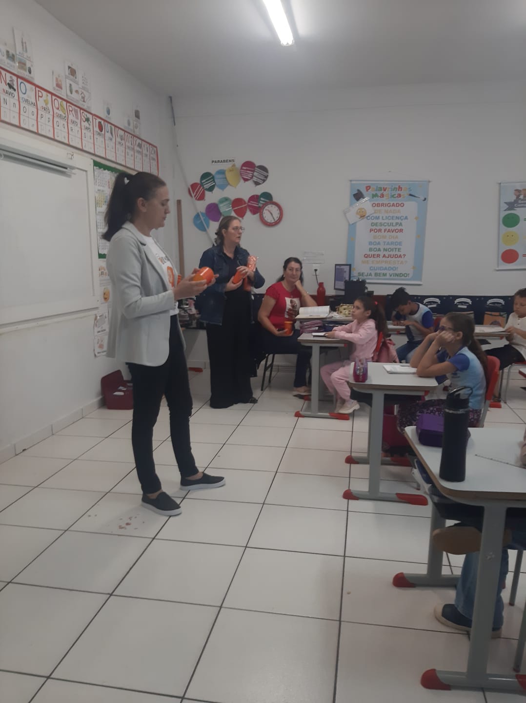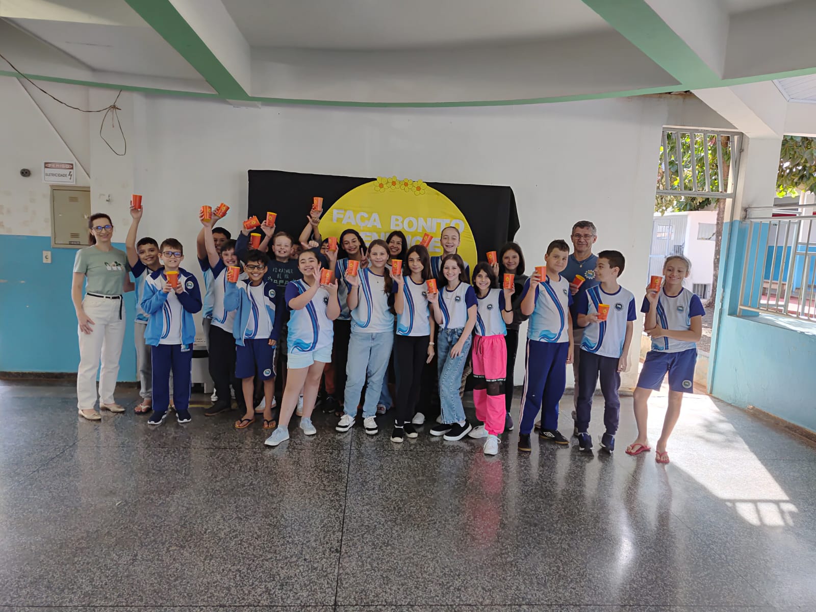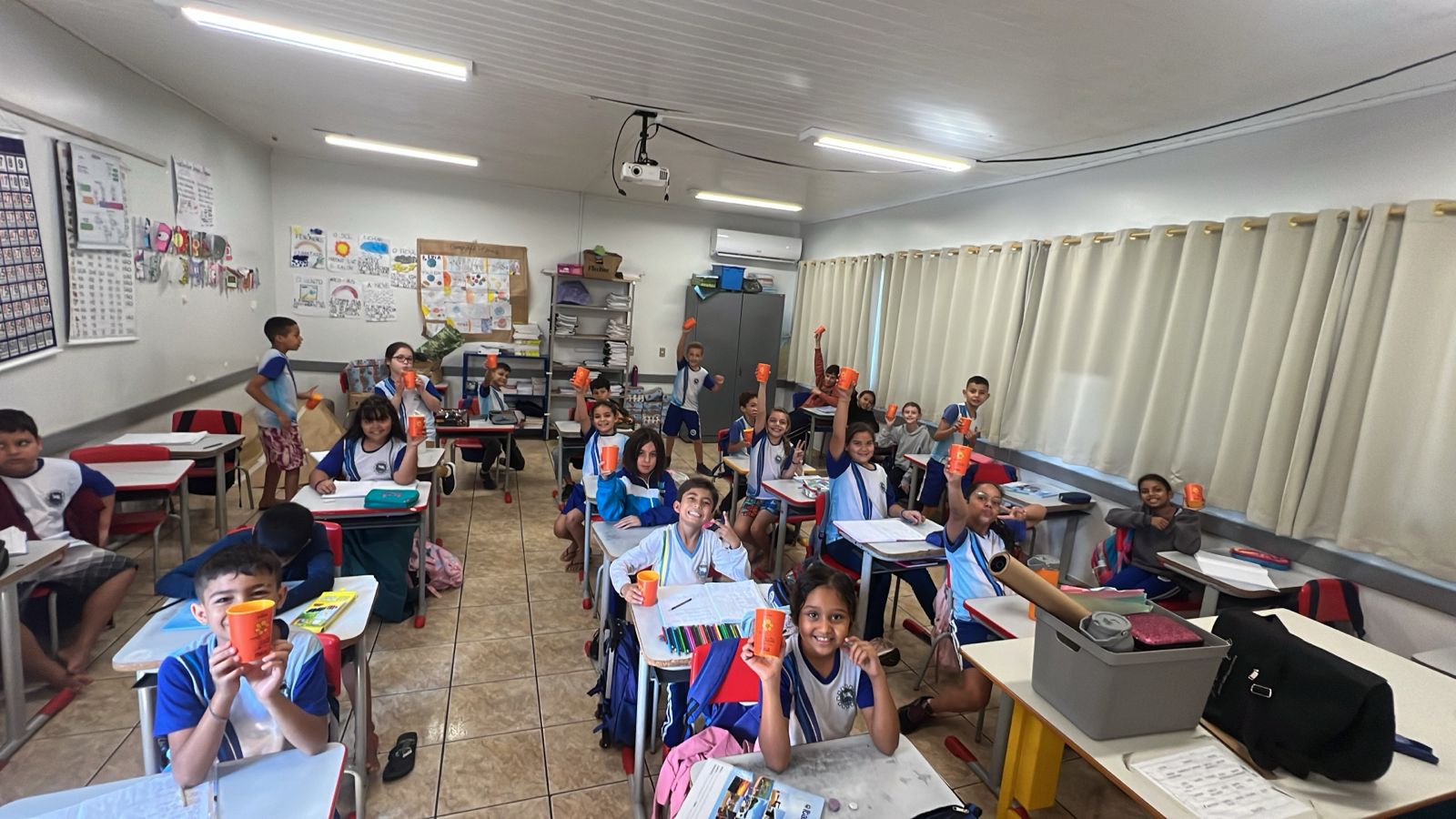 Alunos da rede municipal recebem copos da Campanha Maio Laranja em ação com a Frivatti