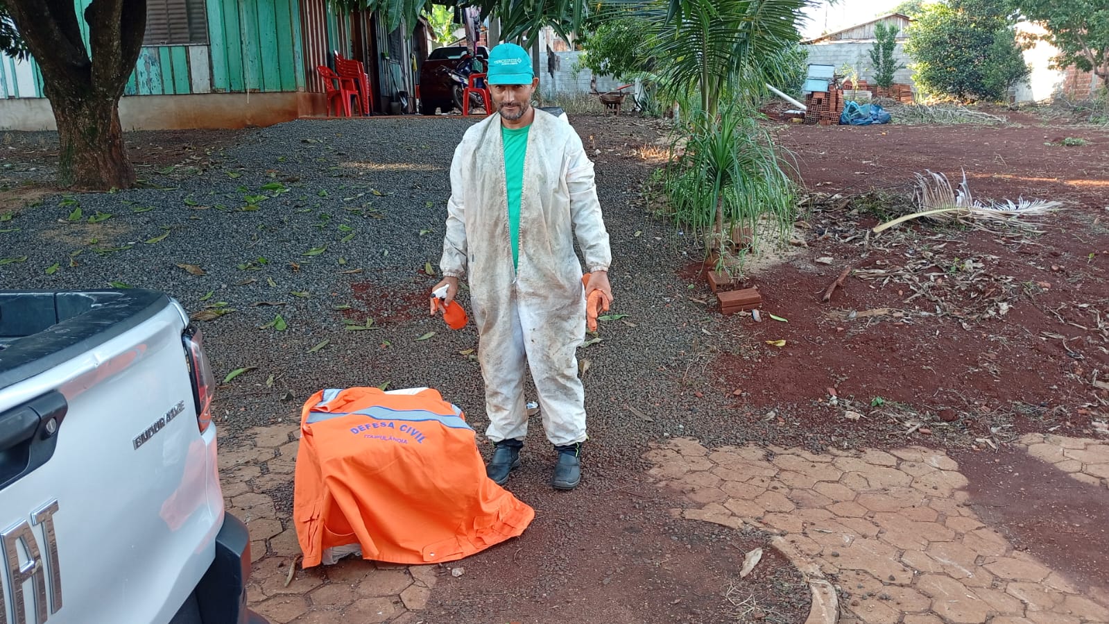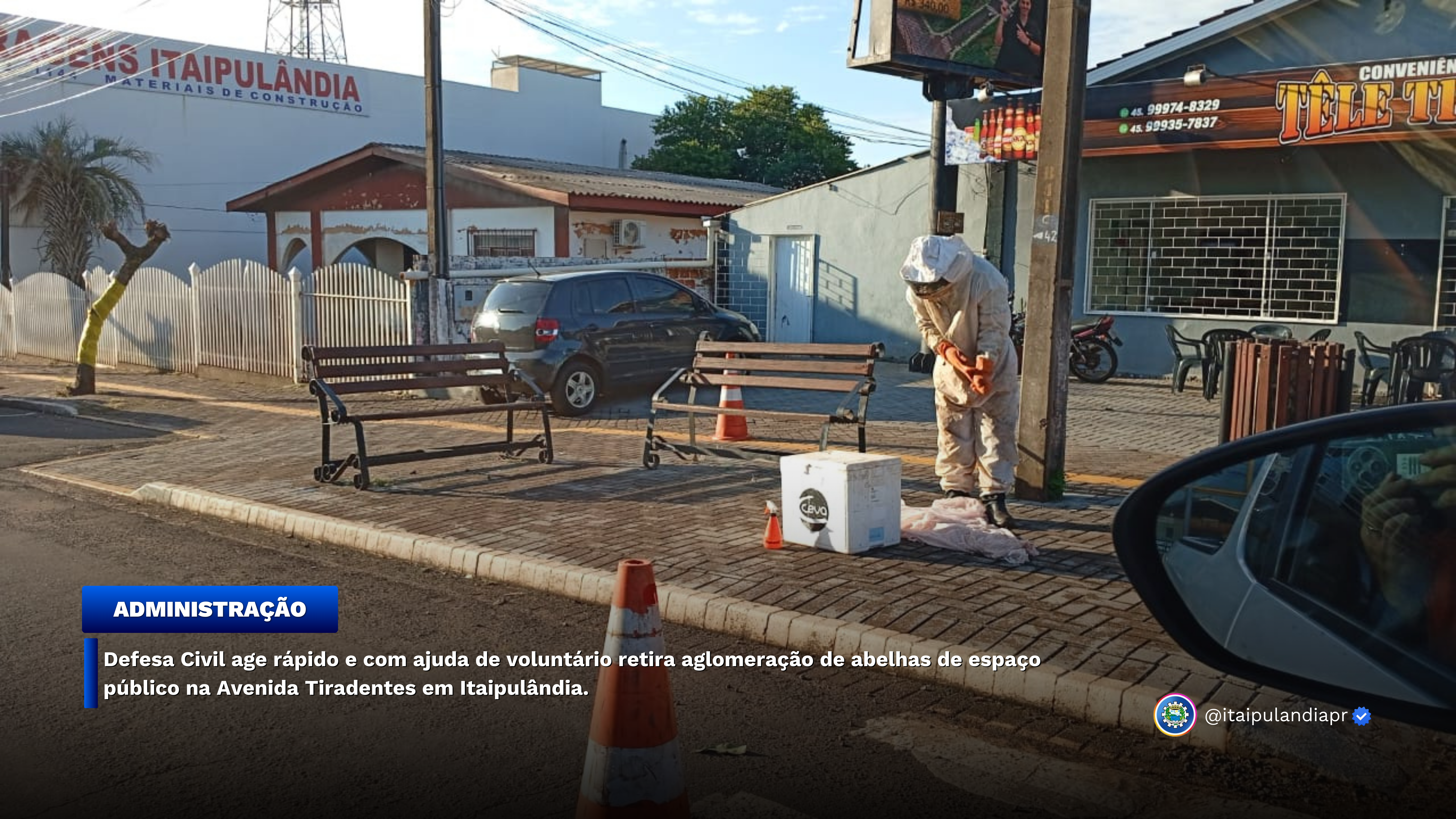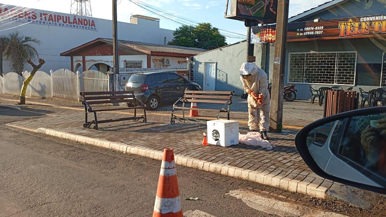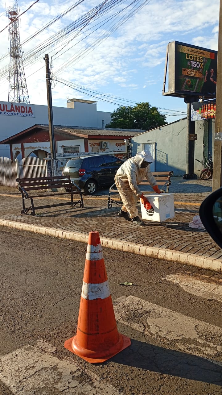 Defesa Civil age rápido e com ajuda de voluntário retira aglomeração de abelhas de espaço público na Avenida Tiradentes em Itaipulândia