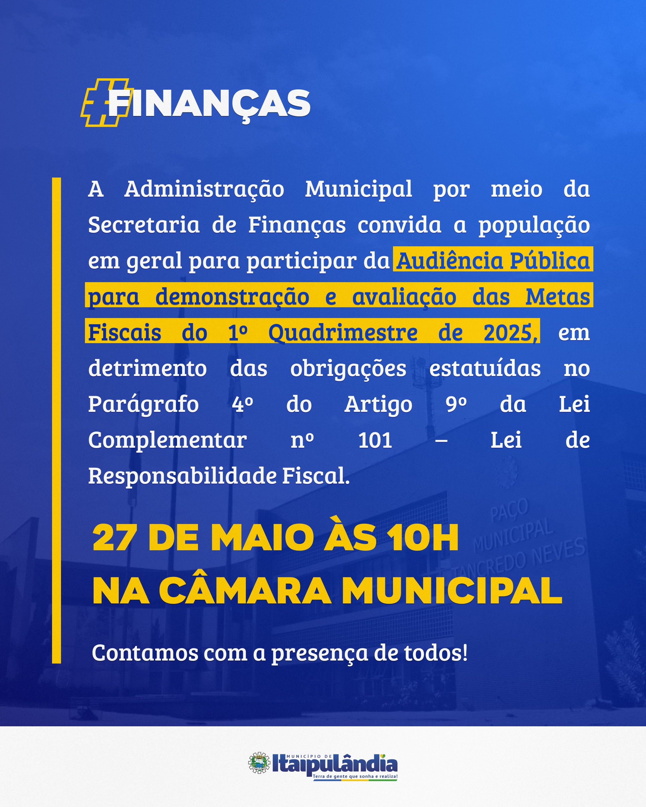 Audiência Pública para demonstração e avaliação das Metas Fiscais do 1º Quadrimestre de 2025, em detrimento das obrigações estatuídas no Parágrafo 4º do Artigo 9º da Lei Complementar nº 101 – Lei de Responsabilidade Fiscal.