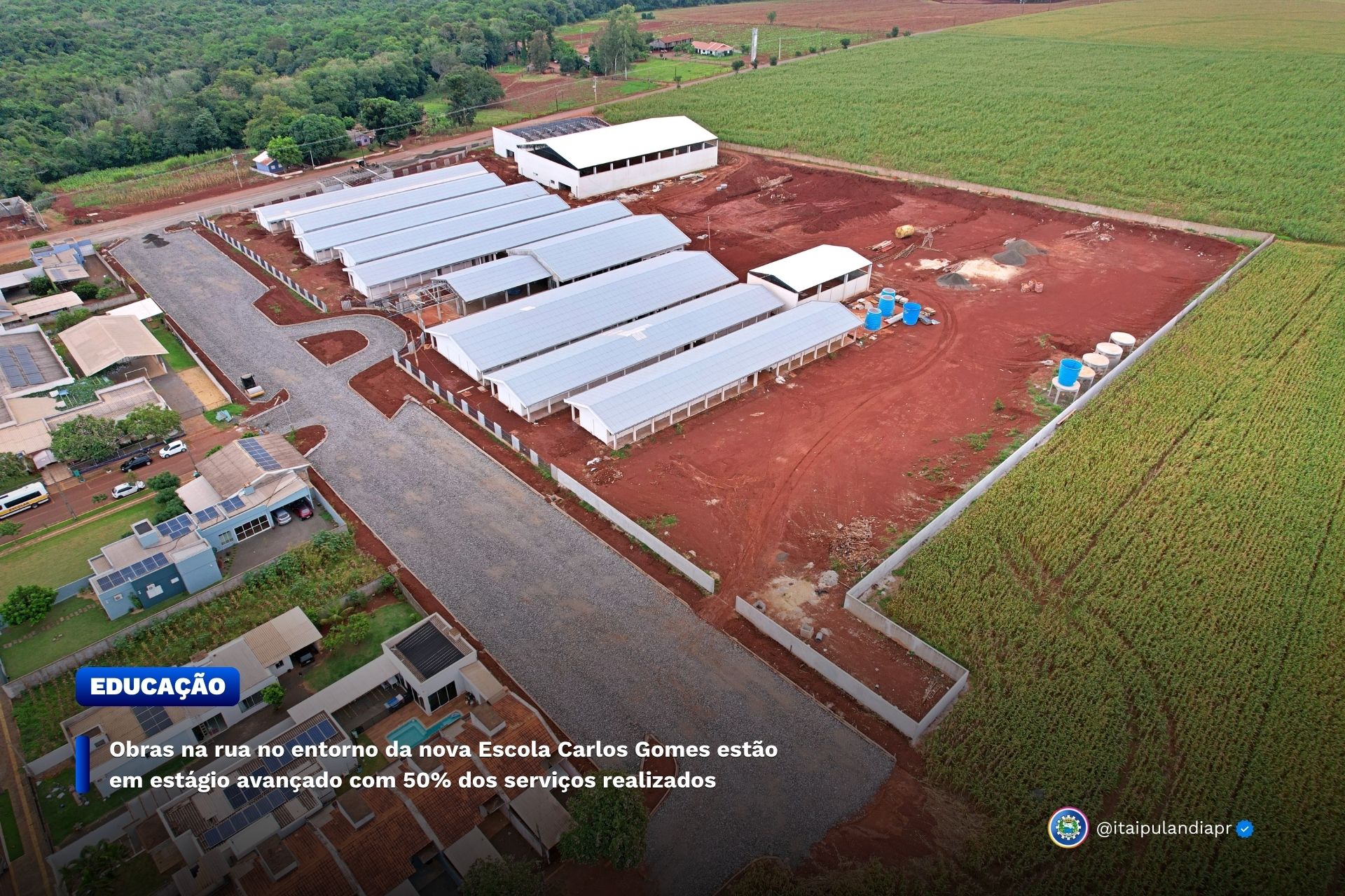 A nova Escola Municipal Carlos Gomes, considerada uma das maiores obras da história do Município, é uma importante conquista para a educação de Itaipulândia e atenderá a crescente demanda de vagas para o setor educacional e desta forma as obras no entorno trarão as melhorias necessárias.