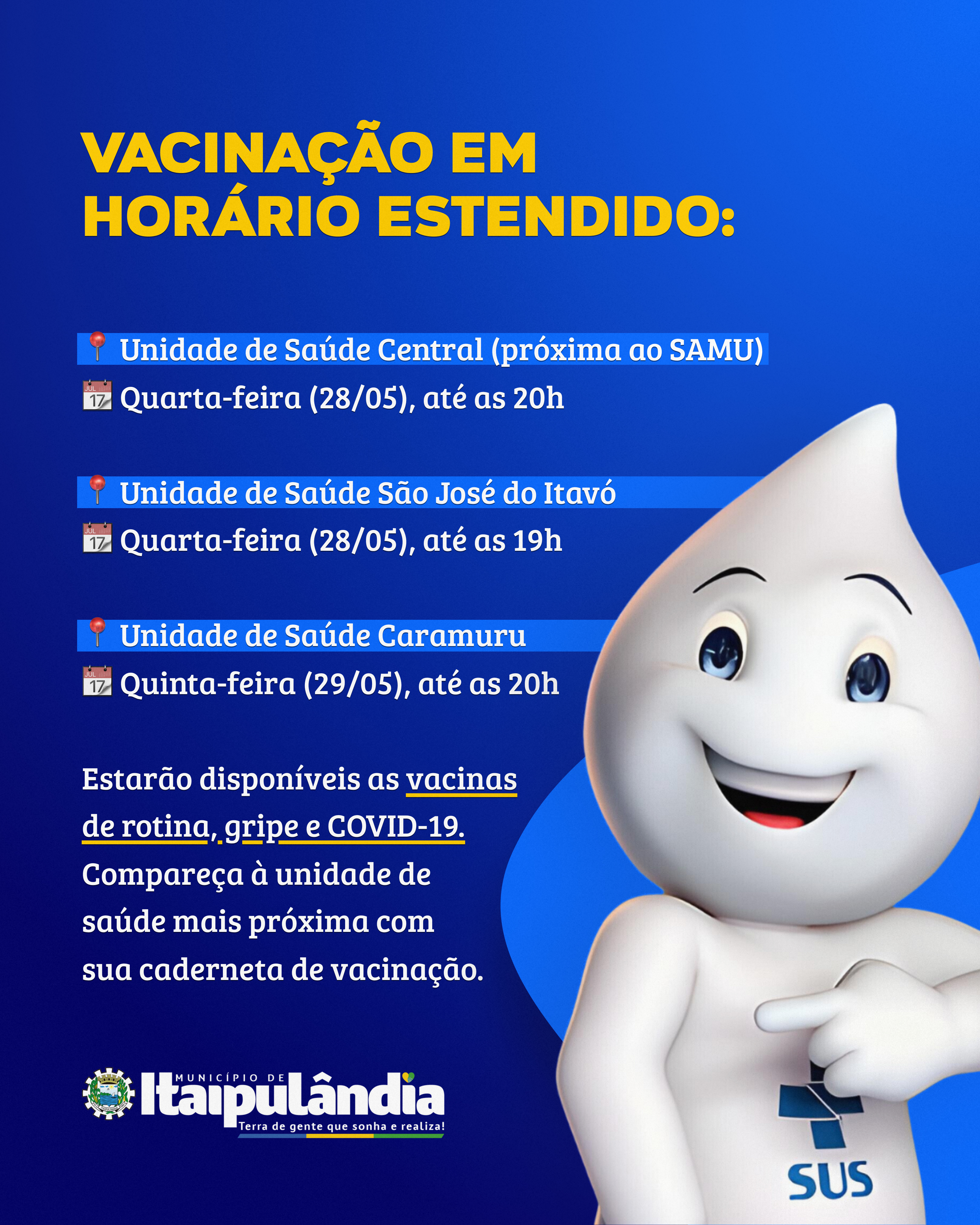 A Secretaria Municipal de Saúde comunica que estará com horários estendidos para vacinação, confira na imagem as unidades, datas e horários. Compareça à unidade de saúde mais próxima com a caderneta de vacinação em mãos!