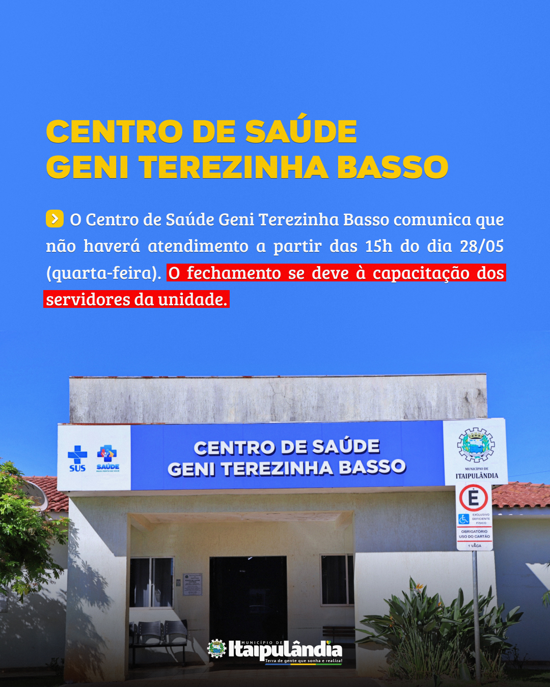 Confira o comunicado sobre o atendimento do Centro de Saúde Geni Terezinha Basso válido para amanhã 28/05 (quarta-feira).